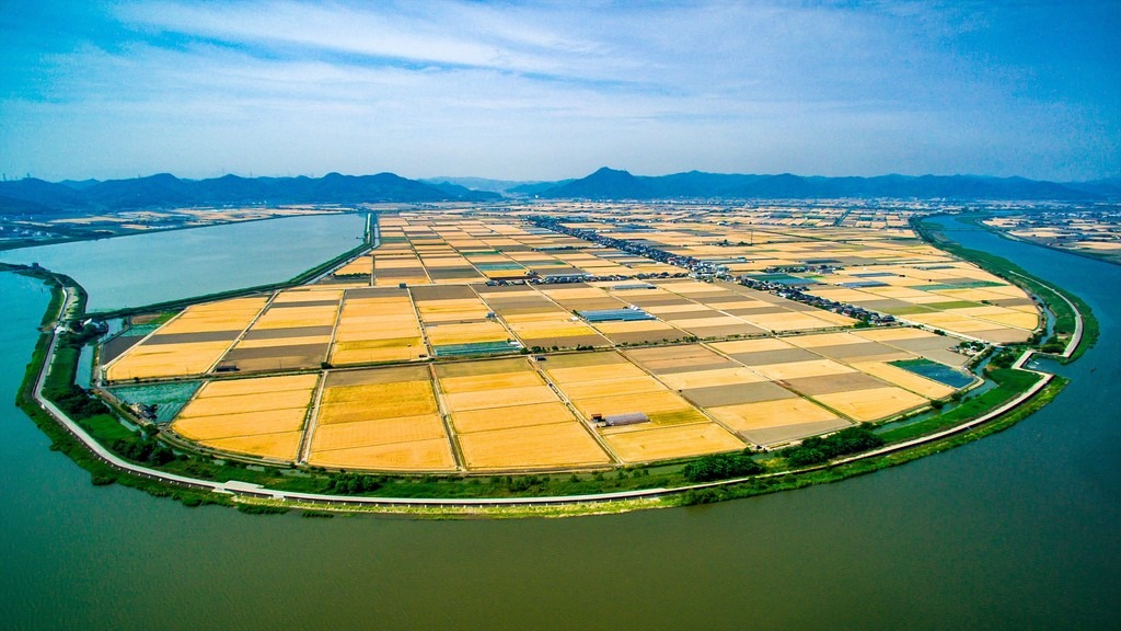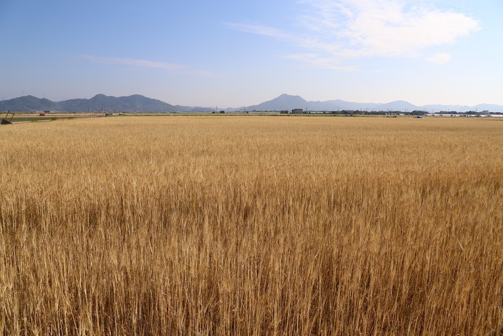 岡山市南区の児島湾干拓地周辺は、県内最大規模のビール麦(二条大麦)産地。例年、5月下旬~6月上旬に、麦の穂が色づき収穫のピークを迎えます。