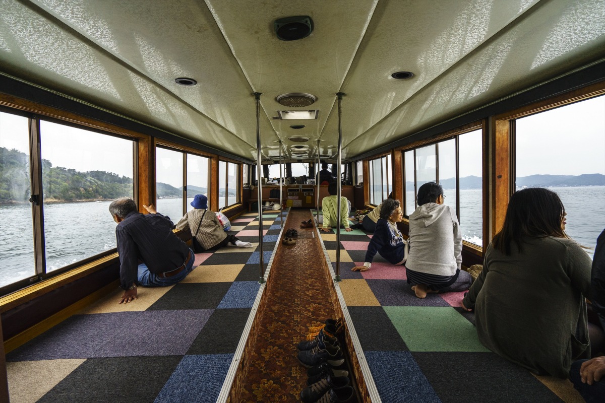 児島観光港から出発。心地よい海の風を受けてゆっくりと瀬戸内の多島美を満喫できる約45分のクルージング。観光船は定員70名程度、冷暖房完備です。