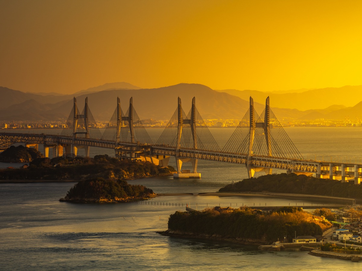 1988(昭和63)年に開通した岡山県と香川県を結ぶ本州四国連絡橋の一つ。橋梁部9,368m、高架部を含めると13.1kmの道路と鉄道を渡す上下二層、世界最大級の橋梁群です。海峡部に架かる吊り橋、斜張橋、トラス橋など6種類の橋梁が連なる景観は圧巻です。週末を中心に、瀬戸大橋がライトアップされ、優雅でロマンチックな雰囲気が楽しめます。