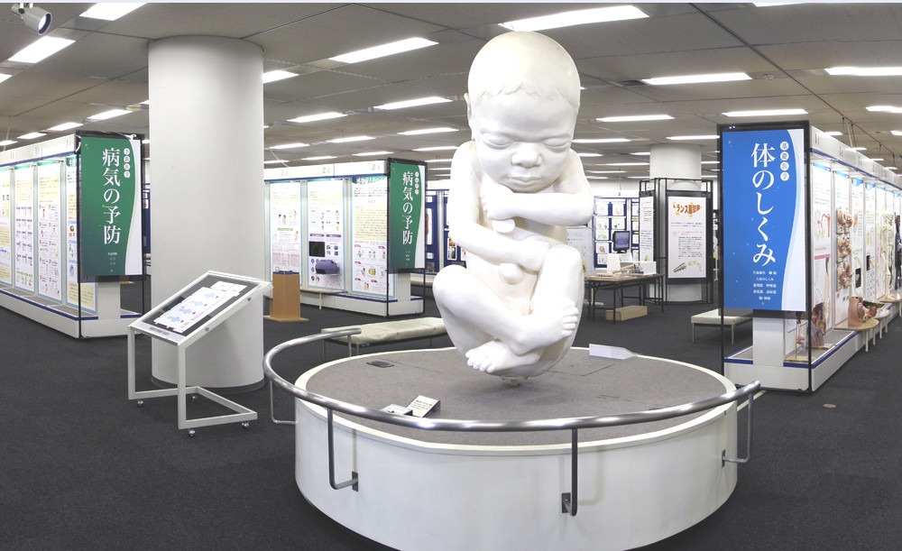 からだのしくみや、病気の予防などを、子どもから大人まで、クイズ形式やゲーム感覚で見学できます。展示はパネル以外にも、骨や臓器の模型、病院で使っている本物の医療器具(胃カメラや腹腔鏡手術の道具)などが置いてあり、それらを手にとって実際に使ってみることもできるようになっています。また、いろいろな体の数値を楽しみながら覚えたり、血圧や体脂肪の測定、運動神経のチェック、一日の食事のカロリー計算、脳卒中の危険度チェック、手洗いチェックなど自分の健康状態を確認したり、生活習慣を見直すことができます。細菌やウィルスなど目では見えないような小さい物を拡大した模型や、実際にからだの中に入ったように見える巨大な胃の模型や心臓の血管模型などがあります。