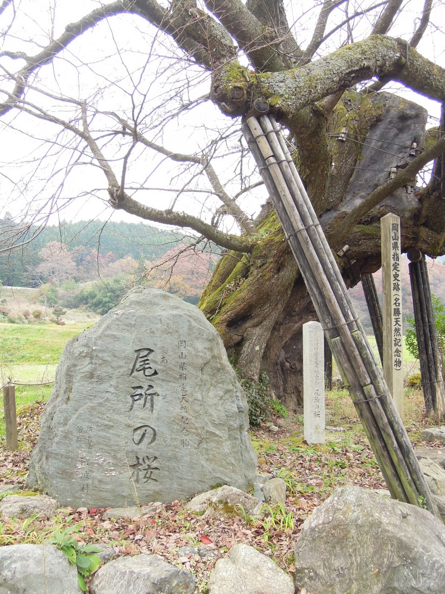 津山市阿波の中央、大畑から加茂川の支流尾所川に沿って登っていくと、河畔に山桜の古樹がそびえ立っています。この木は推定樹齢570年以上のヤマザクラで高さ約16m、枝は四方に約20mに渡って伸びている県下最大級の巨木で、その貫禄に心を奪われます。