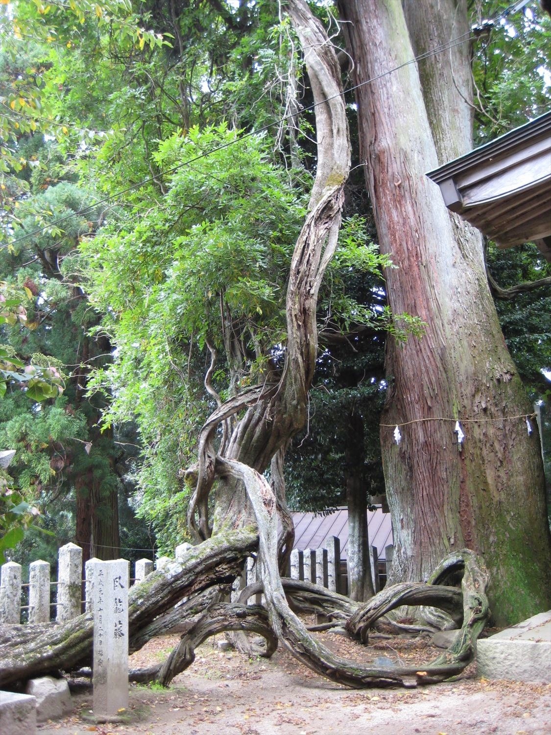 境内には御神木として崇められている推定樹齢660年の大杉があり、目通り周囲5.4m、樹高約40m。美作県民局の名木百選です。
