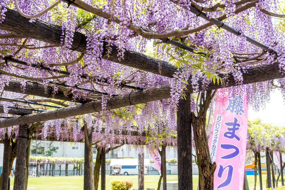 全長約900mの日本有数のスケールの藤棚があり、白砂青松の瀬戸内海らしい景観とともに、壮観な光景が楽しめます。4月下旬~5月上旬に見頃を迎えます。