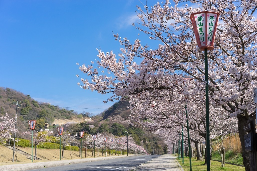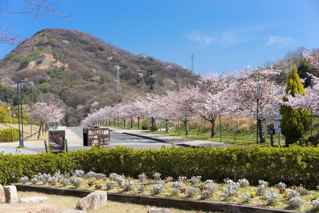 玉野市のほぼ中央部、国道30号に接した標高50~180mと起伏に富んだ地形に、松の緑に囲まれた5つの池が点在する公園です。園内には約7,000本の桜をはじめ梅、椿、ツツジ、あじさい、モミジなど300種超、約15万本が植栽されています。