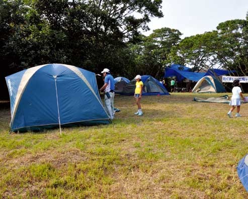 笠岡港から船で約30分の離島です。桟橋などがない完全な無人島の小高い丘に開かれたキャンプ場があり、キャンプファイヤーも可能です。