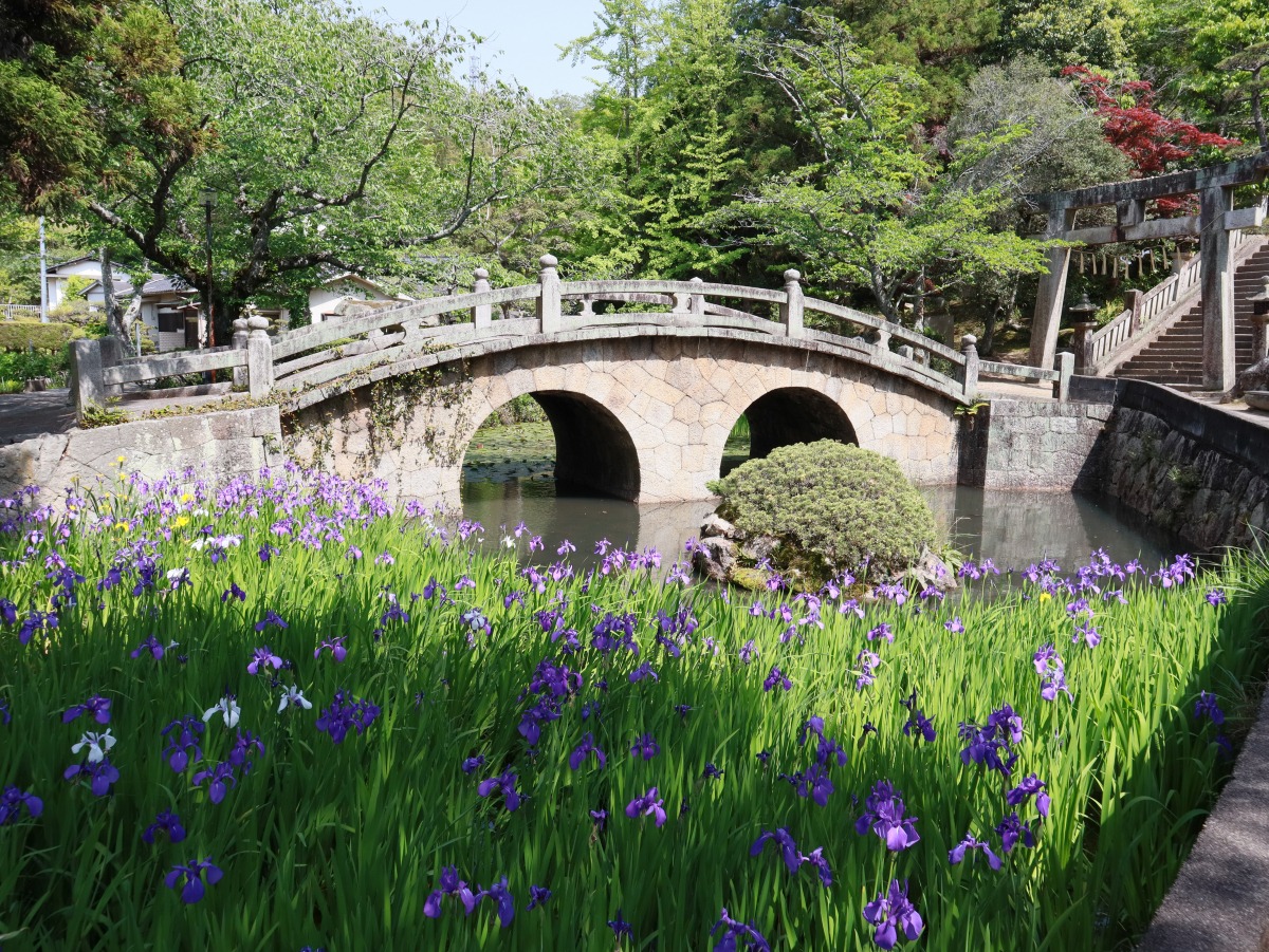 神社の境内にある池一面にカキツバタが咲き、池に架かる眼鏡橋とともに独特の景観を生み出します。