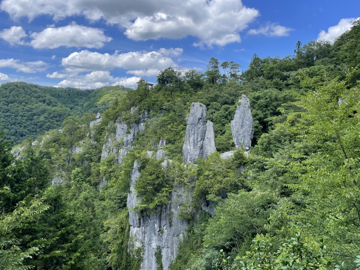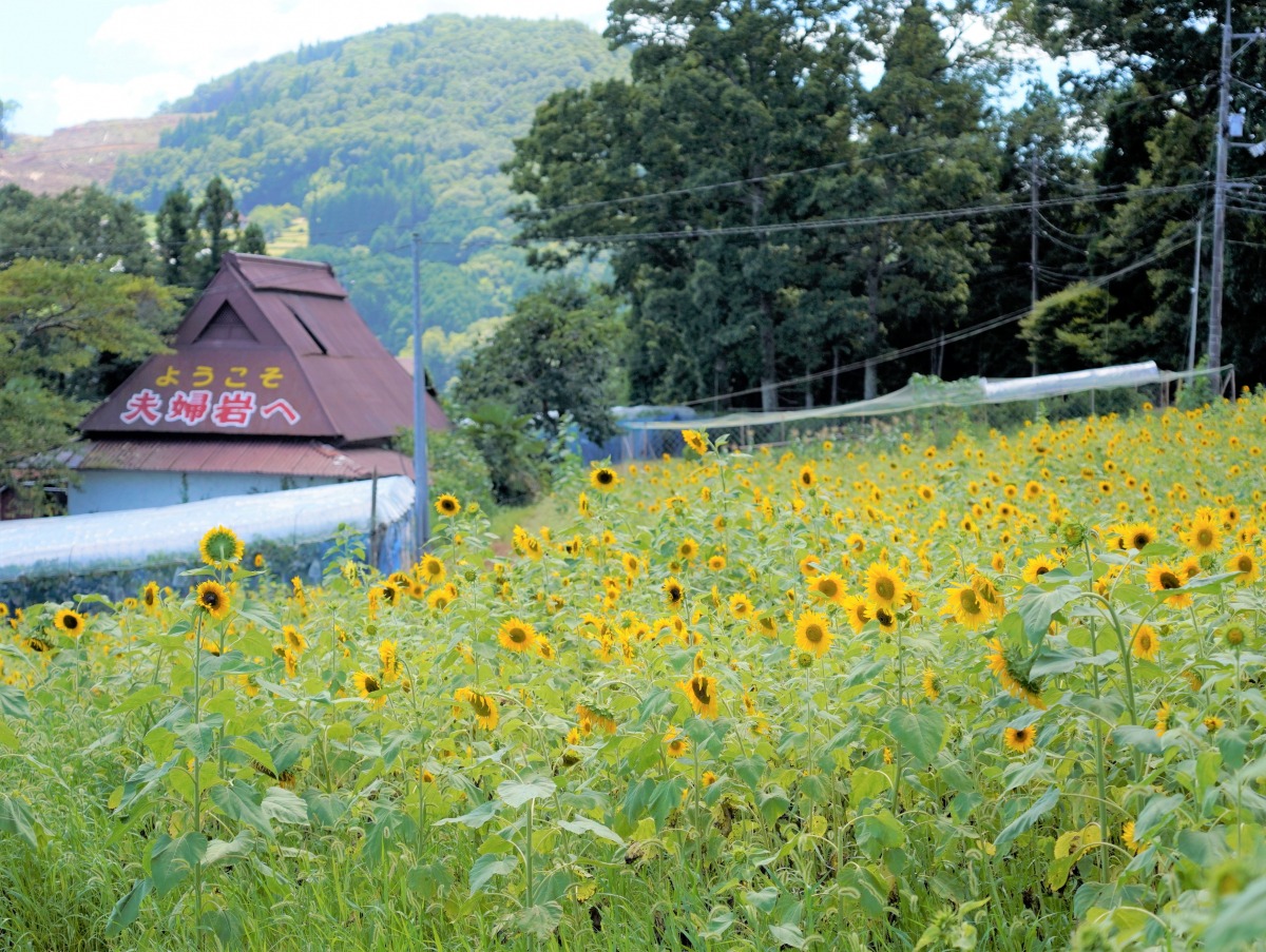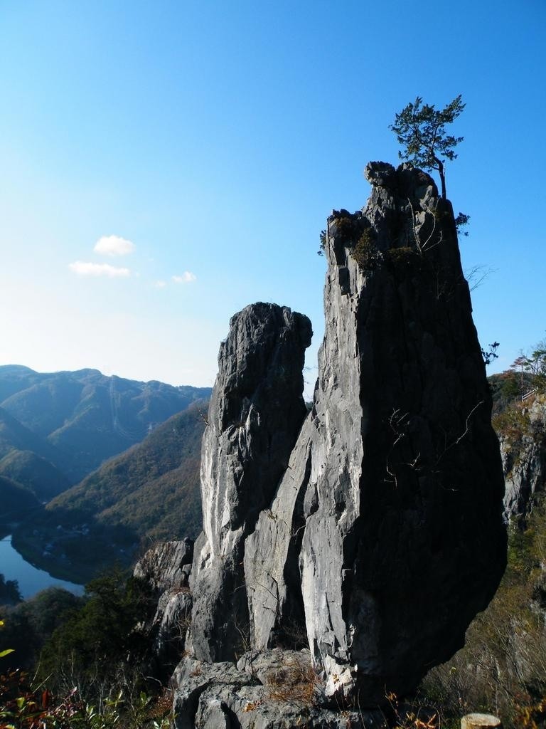 標高400mの石灰岩の台地上にそびえる、自然が生み出した華麗な三つの大塊。夫岩は高さ12m、妻岩は高さ16mで愛児のような岩を抱いています。夫岩は下部が細く、くさびのような岩と岩自体の形状から、絶妙なバランスによって支えられており、見ごたえ十分。周辺では、春には菜の花、夏にはひまわりが咲き誇ります。岡山県指定名勝です。