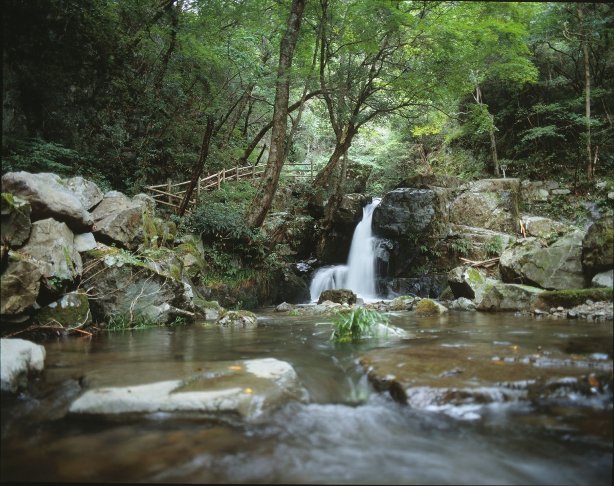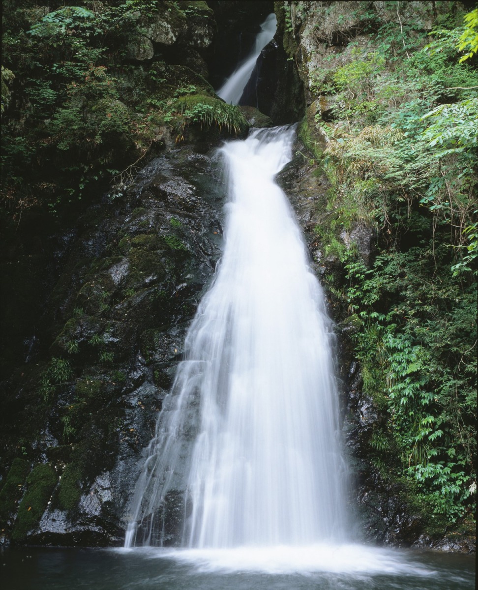 中国山地から流れ出る豊富な清流が三段になって流れ落ちる約30mの滝で、水量によって滝壷の数が変化します。NHK大河ドラマ「武蔵」の撮影もここで行われました。