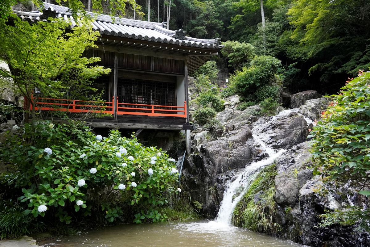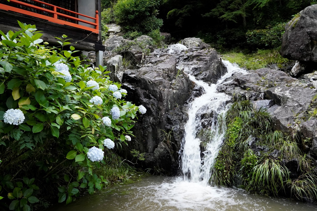 西法院(さいほういん)の境内にある滝で、弁天堂前の大岩を蛇行しながら流下して滝壷に注いでいます。上流には3~5mほどの斜瀑がさらさらと音を立てながら流れ落ちています。