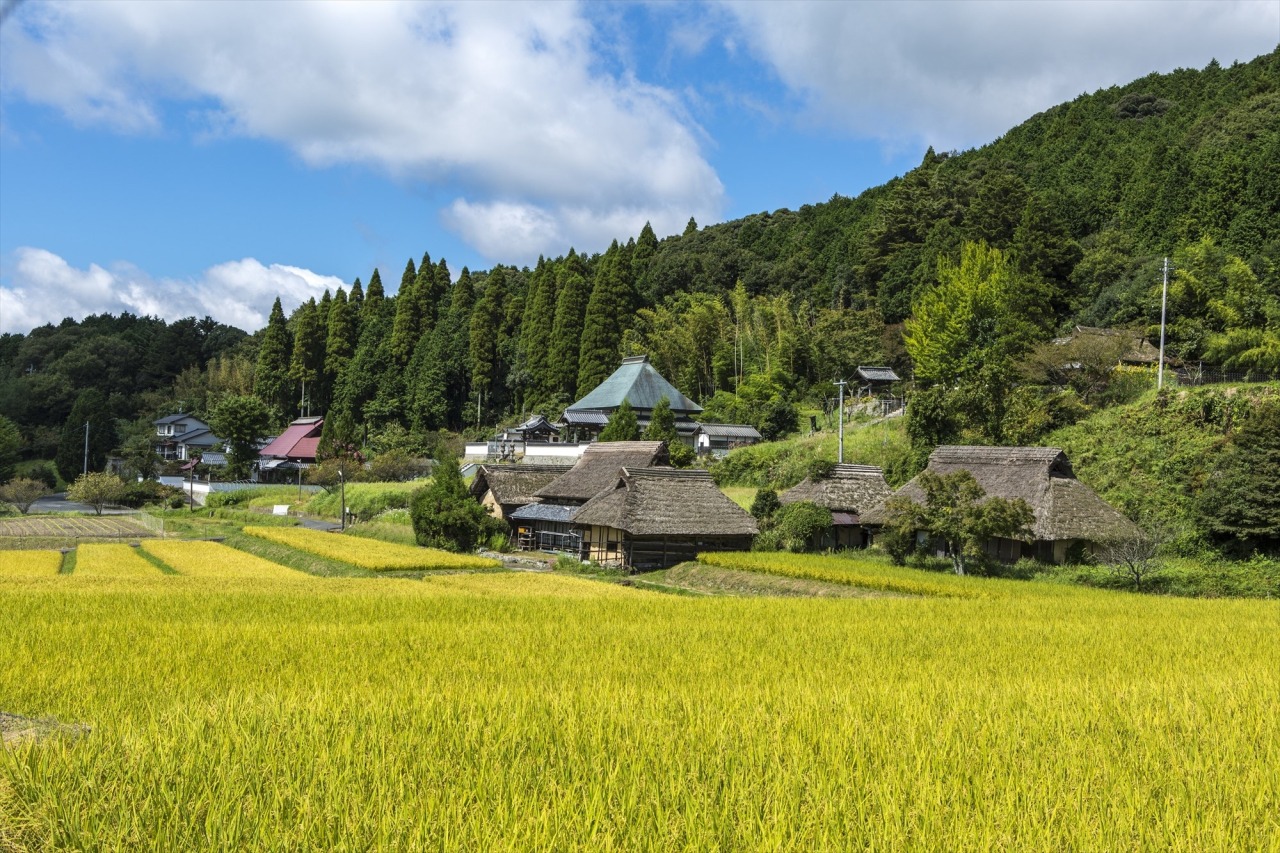 かやぶきの農家が点在するのどかな風景