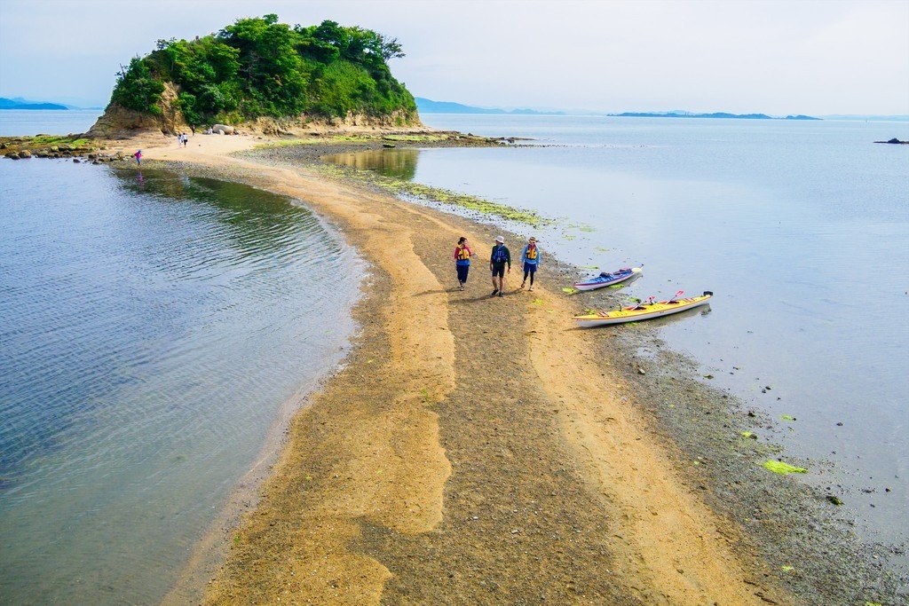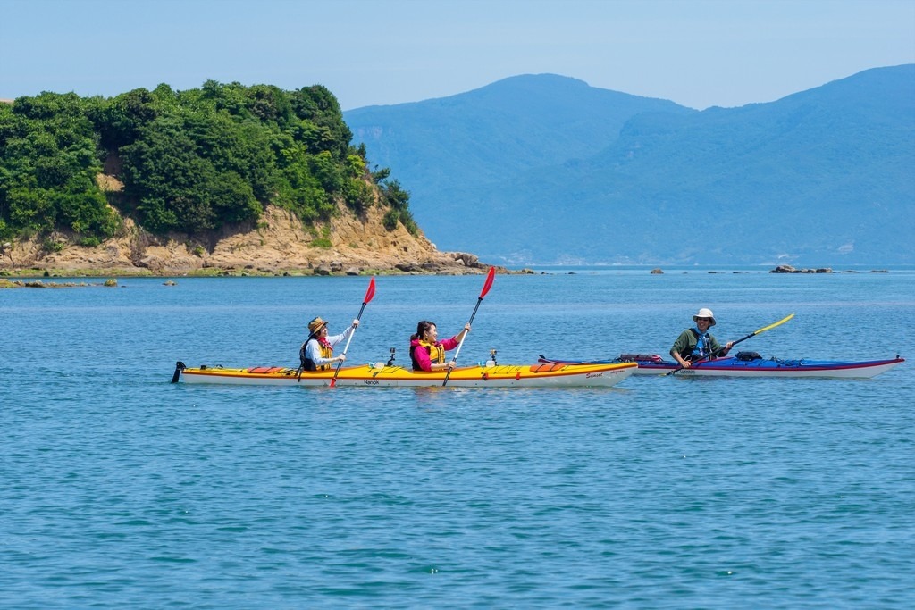 牛窓を楽しむには、シーカヤックがオススメ!自分の力で漕ぐことで、たくさんの発見があります。「海の上を散歩する」そんな言葉がぴったりの乗り物で、ゆったりと瀬戸内の自然を楽しめます。運がよければ、スナメリクジラとの遭遇があるかもしれません。