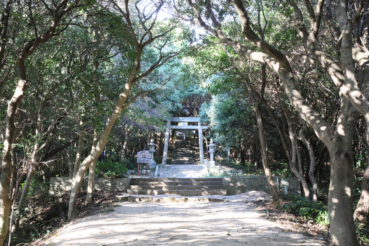 海岸から続く林の中の参道を登ってゆく神社