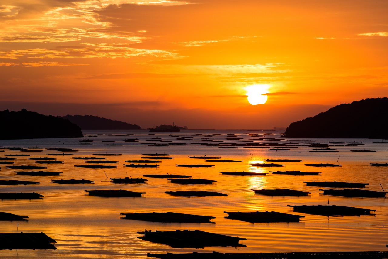 瀬戸内市邑久町の東部に位置する虫明漁港に立って東方海上を望めば、長島と鴻島の間、その先の大多府島と頭島の間、さらにその先の鶴島と鹿久居島の間、海と空が接するあたりから朝日が昇ってきます。空は真っ赤に燃え、海も島も黄金色に染まり、その景観は荘厳そのもの。