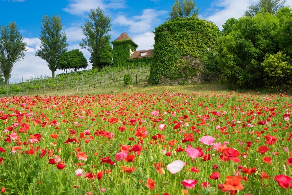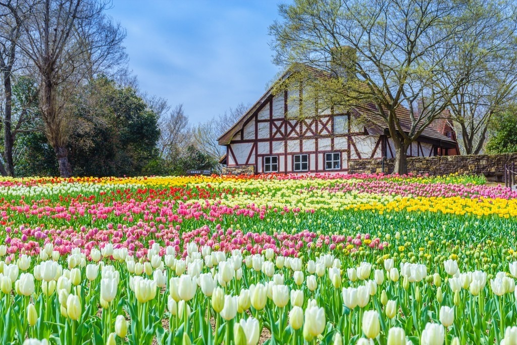 ドイツの農村をイメージした緑に囲まれたテーマパークです。春には菜の花やチューリップ、ネモフィラ、夏にはひまわり、秋にはコスモスがヨーロッパ調の建物をバックに咲き競います。