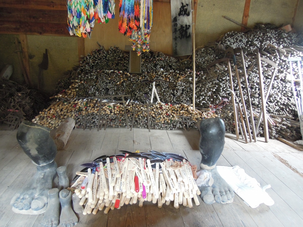 大国主之命、手名椎之命(てなづち)、足名椎之命(あしなづち)の三神をおまつりしており、足のけが、病気に霊験あらたかと評判です。鎌殿には、「病の根を切る。」という願いを込めて多くの鎌や刃物が奉納されています。