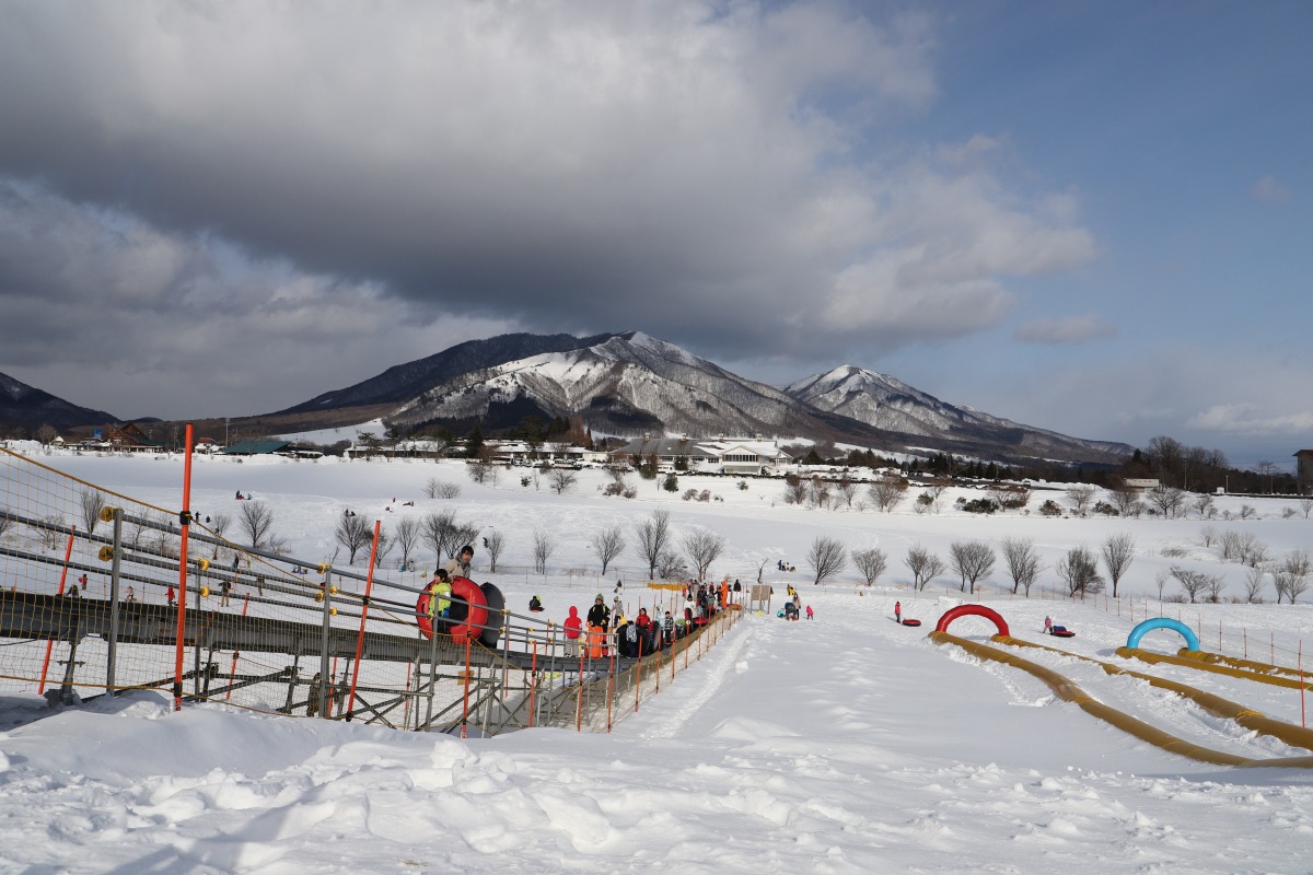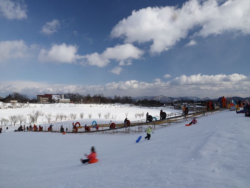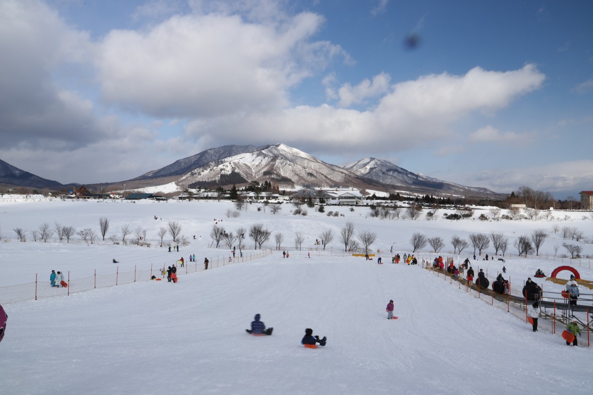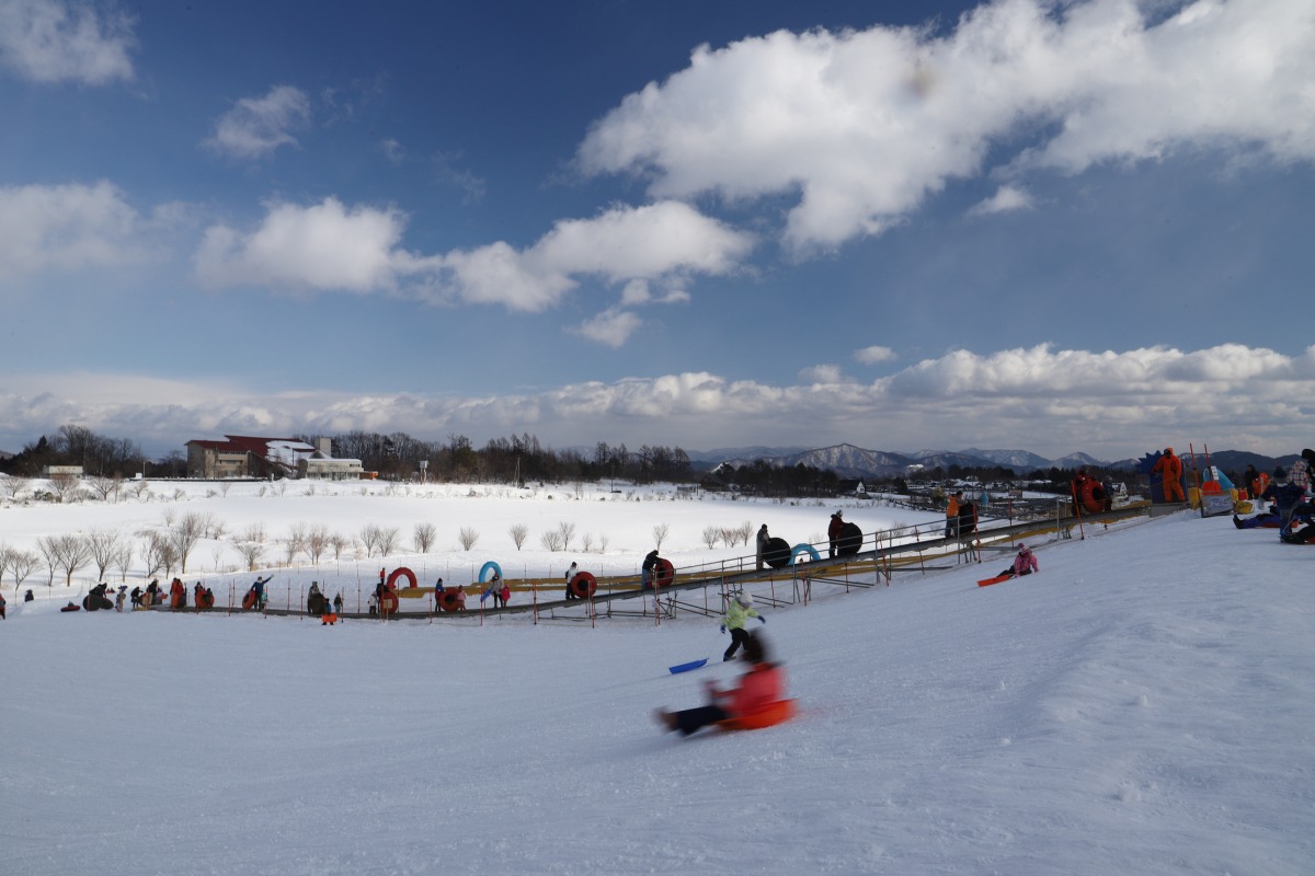 「休暇村蒜山高原」のホテル前に広がる傾斜スペースで、スノーシューターやスライダーなどの雪遊びが楽しめます。※スキー、スノーボードはできません。