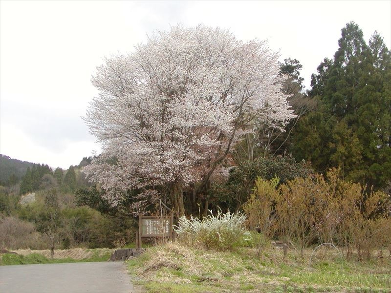 黒岩集落のはずれにある岡山県下第一を誇る桜の巨樹です。岡山県の天然記念物に指定されていて、根元周りは10m、木の高さは16mという巨大さに、推定樹齢は700年。4月下旬に薄い紅色の美しい桜を咲かせます。