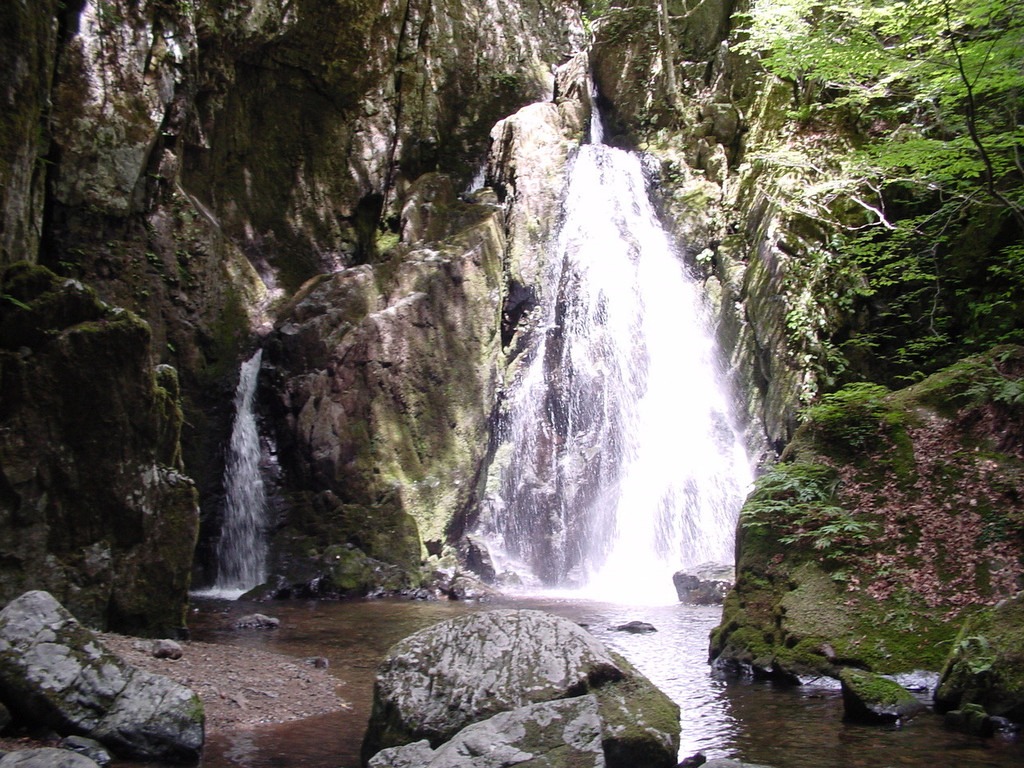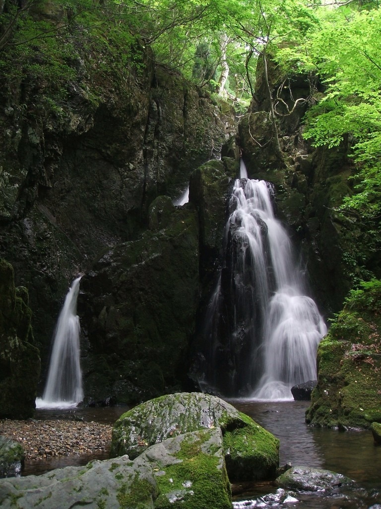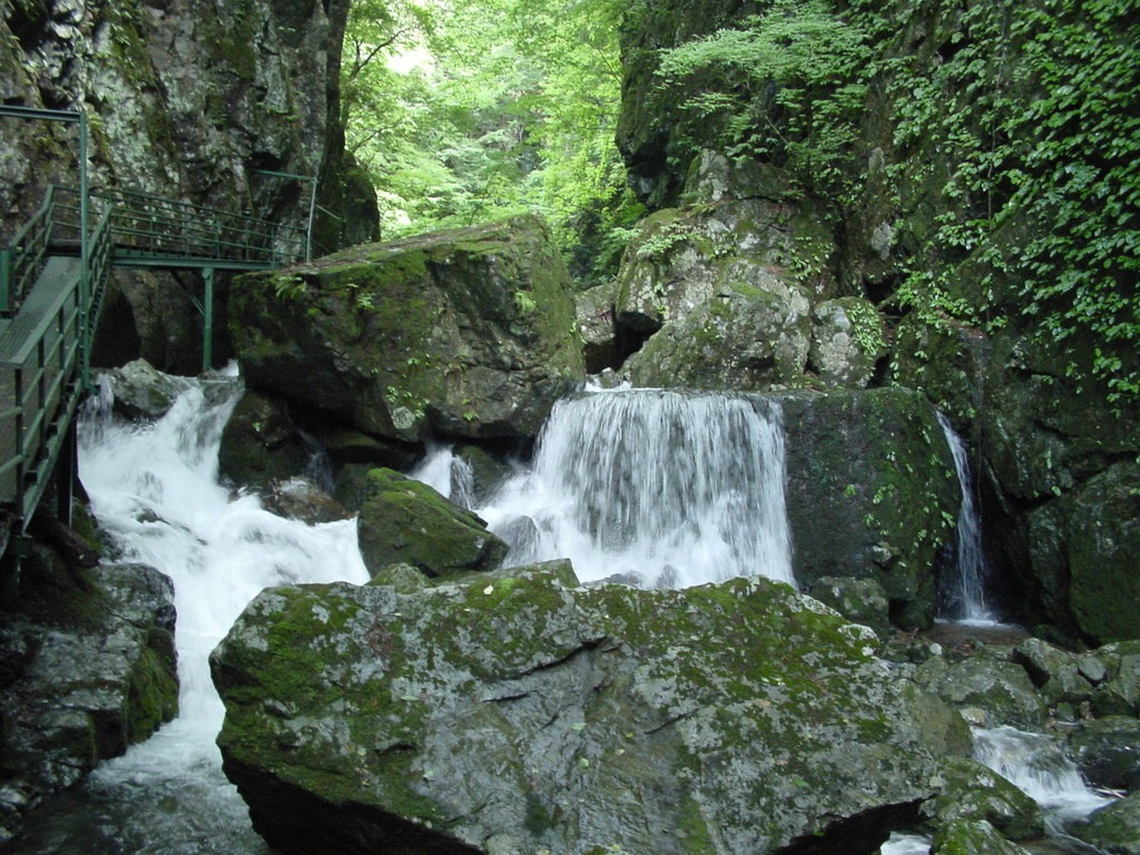 山水画を思わせる巨岩に囲まれた渓谷。特に全長400mの遊歩道を歩いた先にそびえる上流の落差20mの不動滝は、天然の涼&癒し効果満点のイオンミストを感じることのできる見どころの一つ。周辺のブナ林では、オオルリやミソサザイ・アカショウビンなど の野鳥、渓流にはヤマメなど川魚が生息し、近くには珍しいワサビ田も。季節限定で、遊歩道入口の「涼水亭」にて自然の醍醐味も体感できる「そうめん流し」も楽しめます。