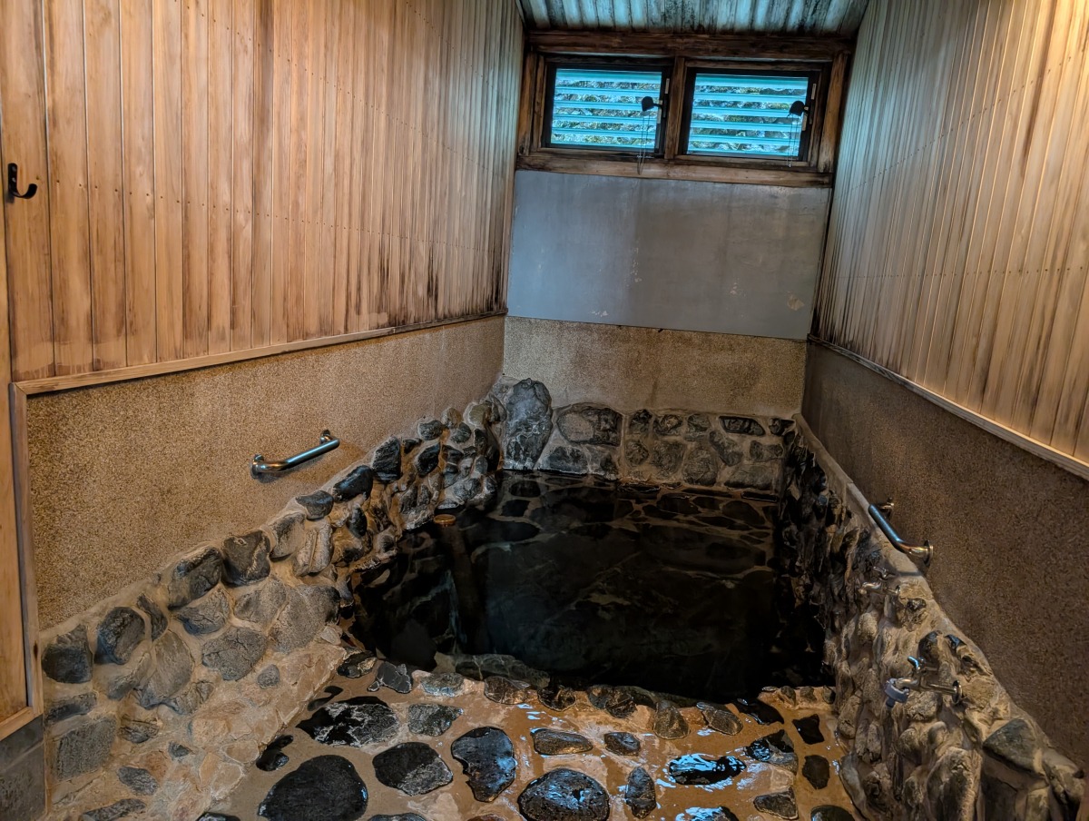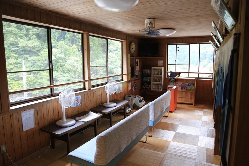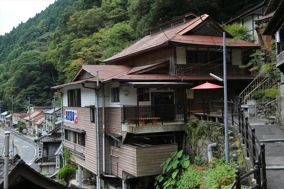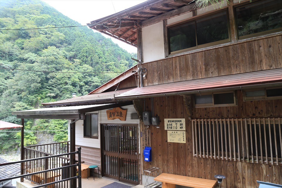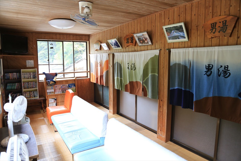山あいの風情ある木造共同浴場。津山藩や勝山藩の殿様が入ったといわれる幕湯は室内の混浴岩風呂で、足元の岩盤から竹筒を通して温泉が涌き出ています。幕湯の他にも普通湯(男女別)と貸切風呂が3か所あります。