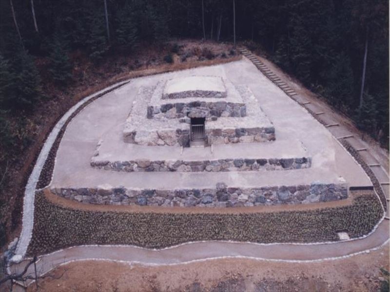 大谷1号墳は大谷・定古墳群のなかでも早くから注目され、調査研究が行われた古墳です。3段の墳丘と前面に2段の基壇をもつ、5段築成の方墳という全国的にもあまり例のないもので、規模は東西で22.7m、南北で16.2m、高さは1段目から墳頂まで8mを測ります。