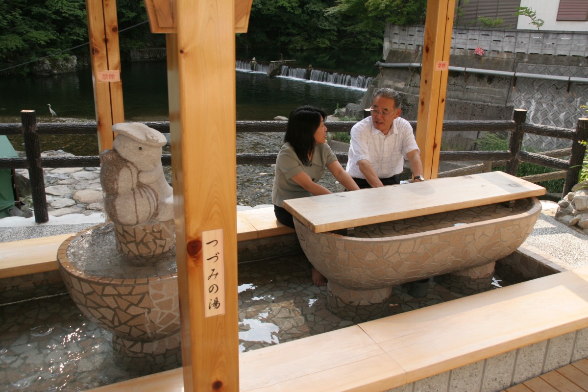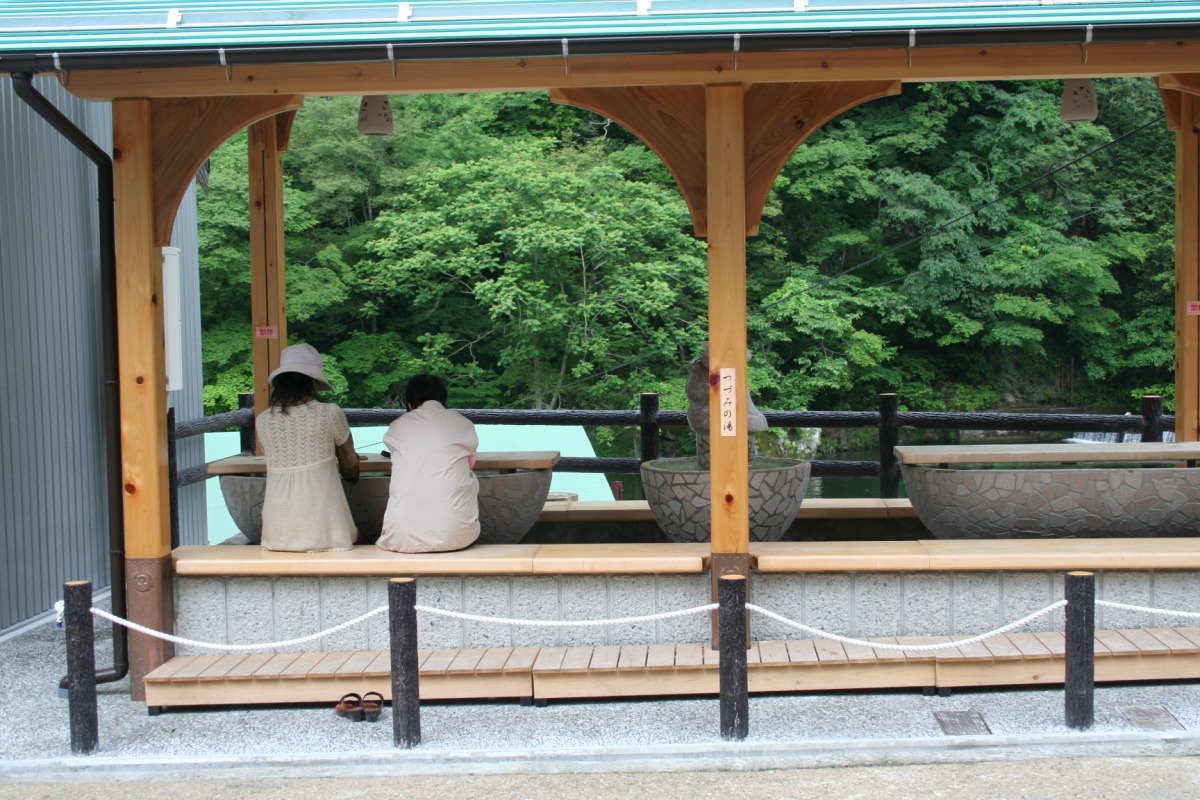 湯原温泉街のつづみ橋のたもとにある手と足を一緒に温めることができる温泉スポット。四肢同時に入浴することで、温浴効果抜群です。