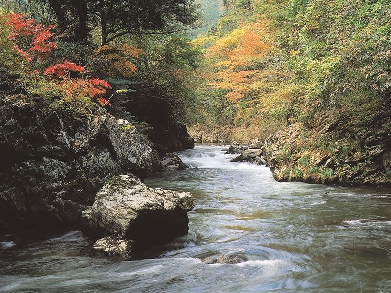 新庄川中流にある長さ約6kmの渓谷で、渓流畔に落葉樹の高木が河畔林をなし、四季折々の美しい風情の変化を楽しむことができます。渓谷では清流と大きな岩やケヤキが美しいコントラストを見せ、周辺には農地や集落が広がるのどかな山里の風景が見られます。また、一帯は国の天然記念物オオサンショウウオの生息地としても知られています。