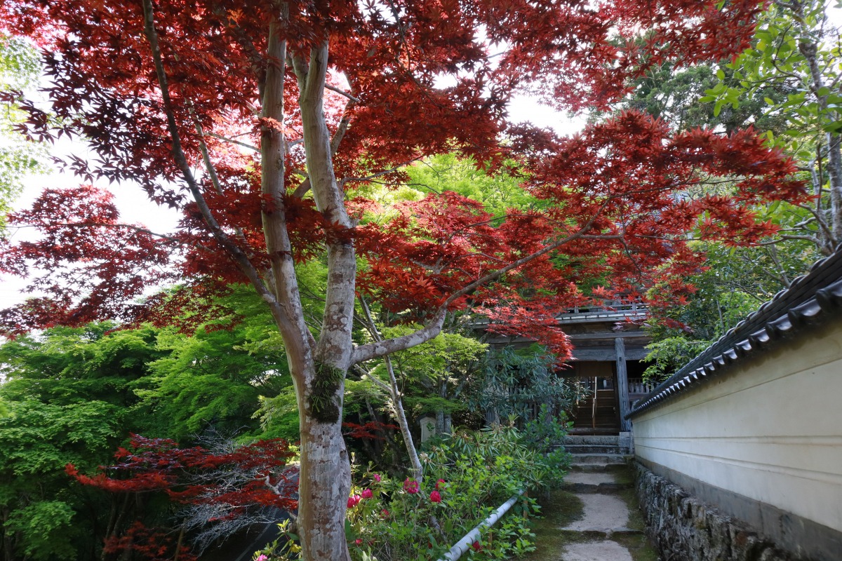 「花の山寺」と呼ばれ、春はしゃくなげ、初夏には紫陽花、夏にはゆうすげ、秋にはそばの実など四季折々に花を楽しむことができます。特に桜は春と秋の2回に渡って花を咲かせる四季桜が植えられえていて、秋にはモミジの赤と四季桜のピンクのコントラストを楽しむことができます。