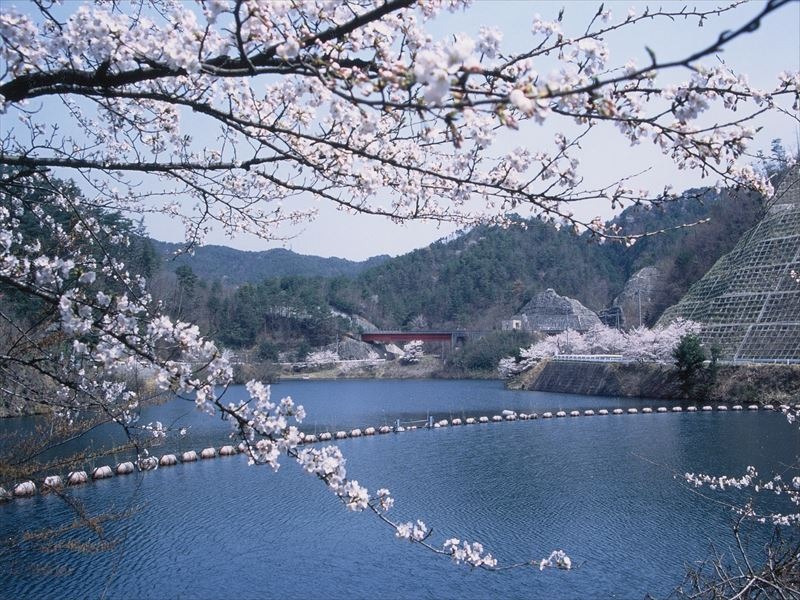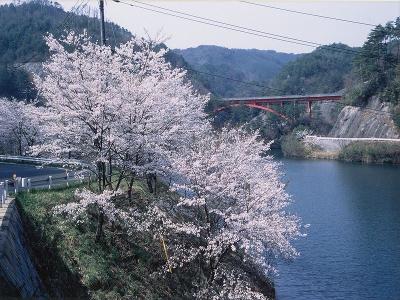 中国山地の山並みや高速道路の赤いアーチ橋などが見られるダム。約100本のソメイヨシノやヤマザクラが咲き、湖面に映えます。ダム外周の遊歩道は約2.8kmあり、四季折々のどかな景色が広がります。4月上旬~中旬には多くの人が花見に訪れ、秋には紅葉も楽しめます。隣接する「もみじ公園」には遊具や芝生広場もあり、ピクニックなど家族で楽しく過ごせます。
