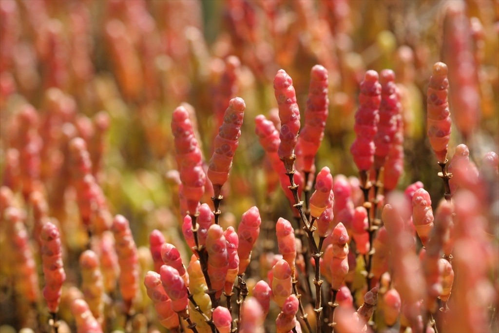 アッケシソウは塩分の多い湿地帯に生える葉のない1年草で、高さは10~30cmほど、茎は丸く肉厚で10月中旬頃には深紅に紅葉することからサンゴ草とも呼ばれています。寄島干拓地内のアッケシソウは、本州唯一の自生地と言われています。