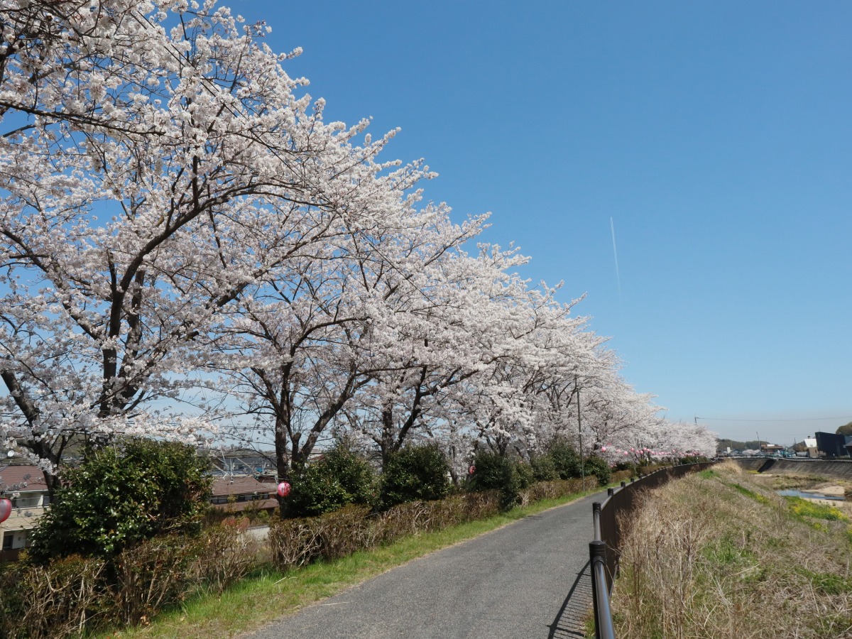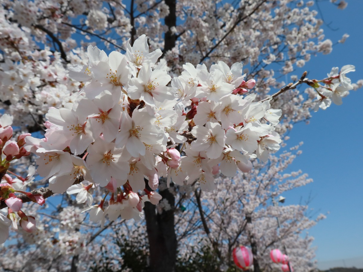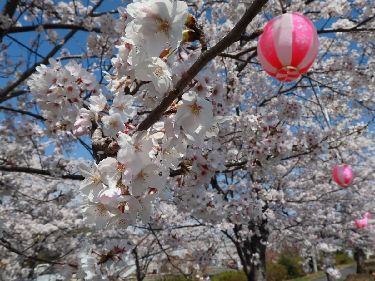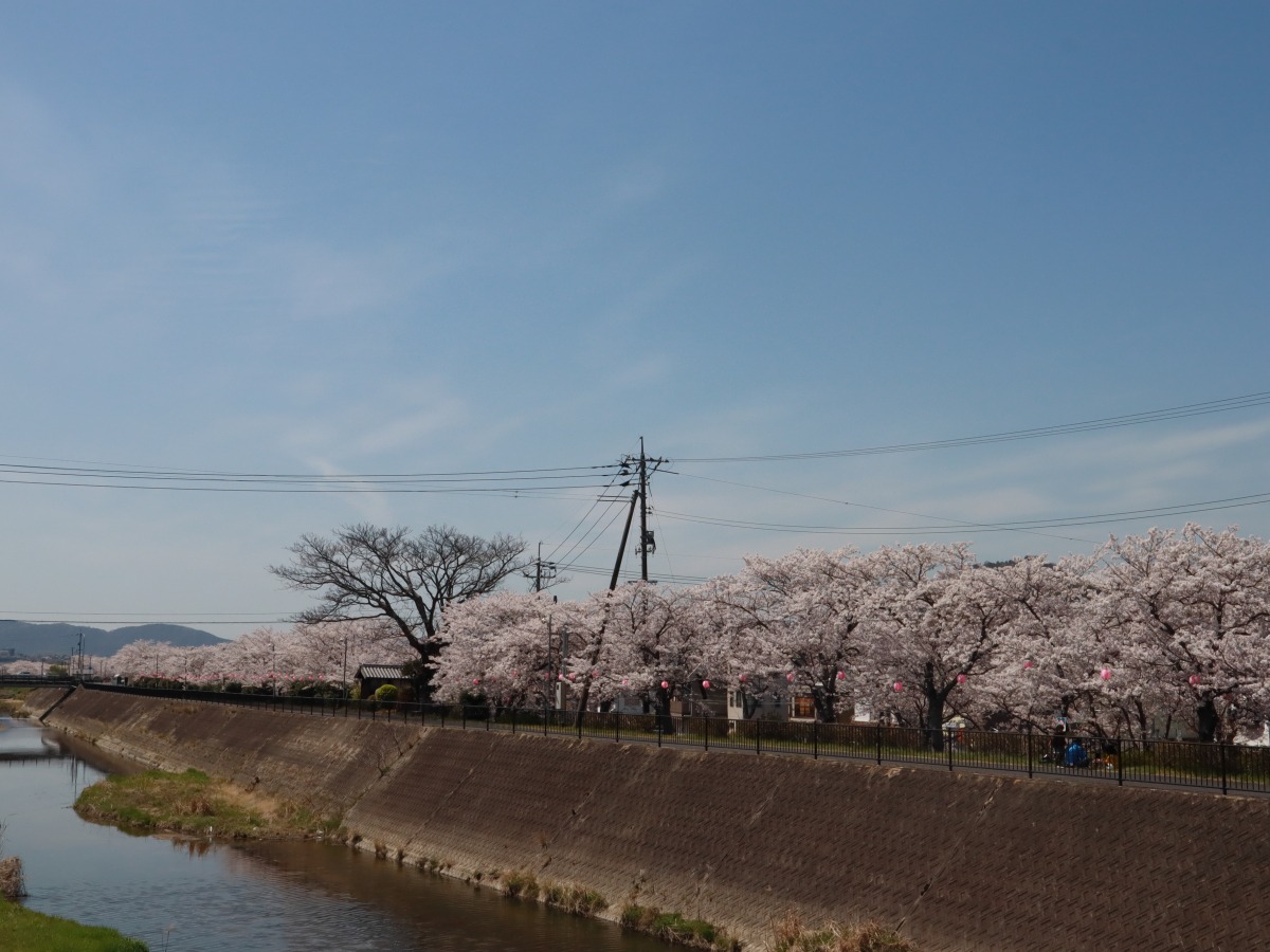 JR金光駅南側にある里見川沿いの桜並木は、遊歩道や花見台が整備されていて、ゆっくりと桜を眺めることができます。開花中は夜間に提灯でライトアップもしています。