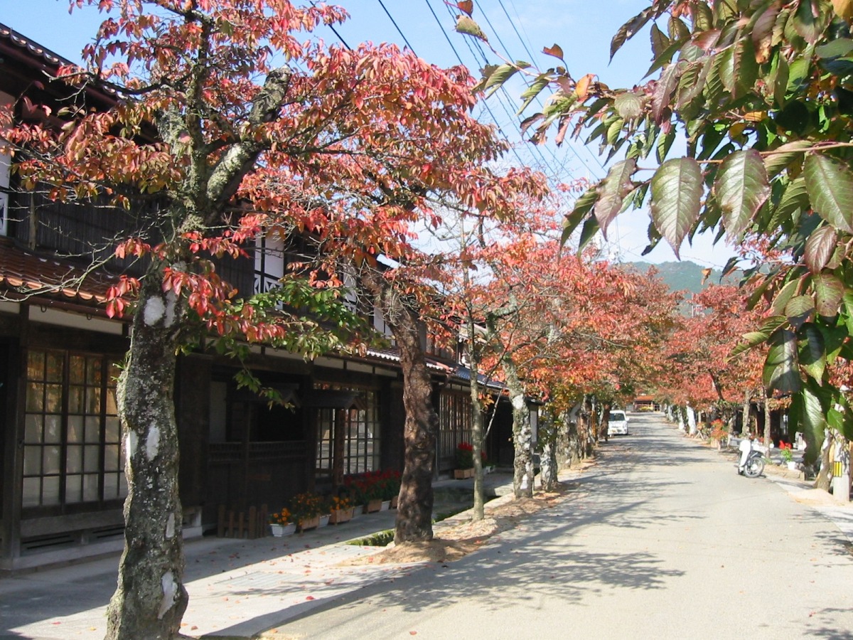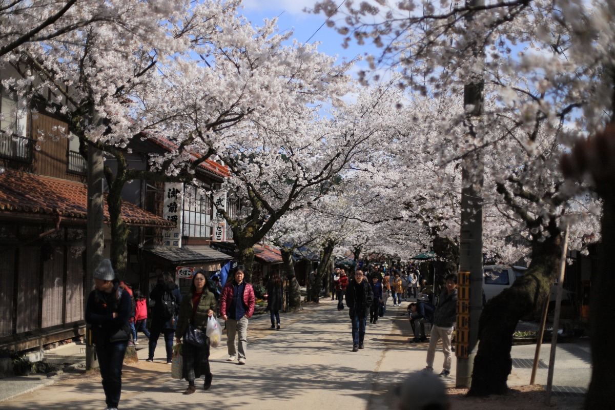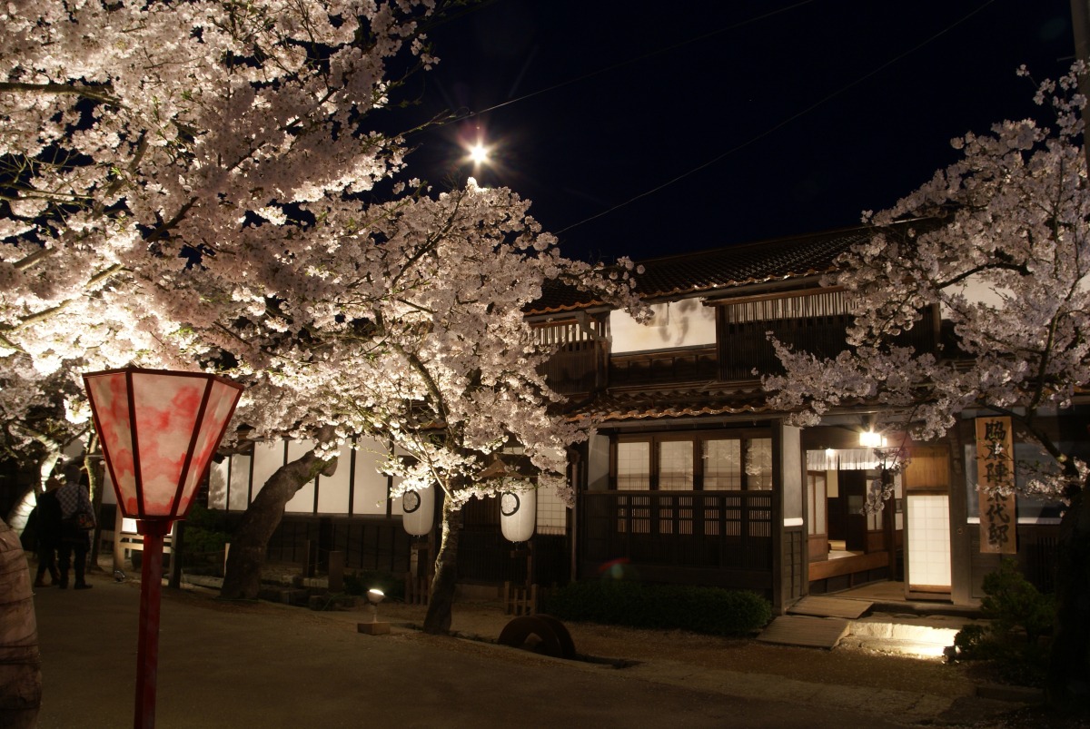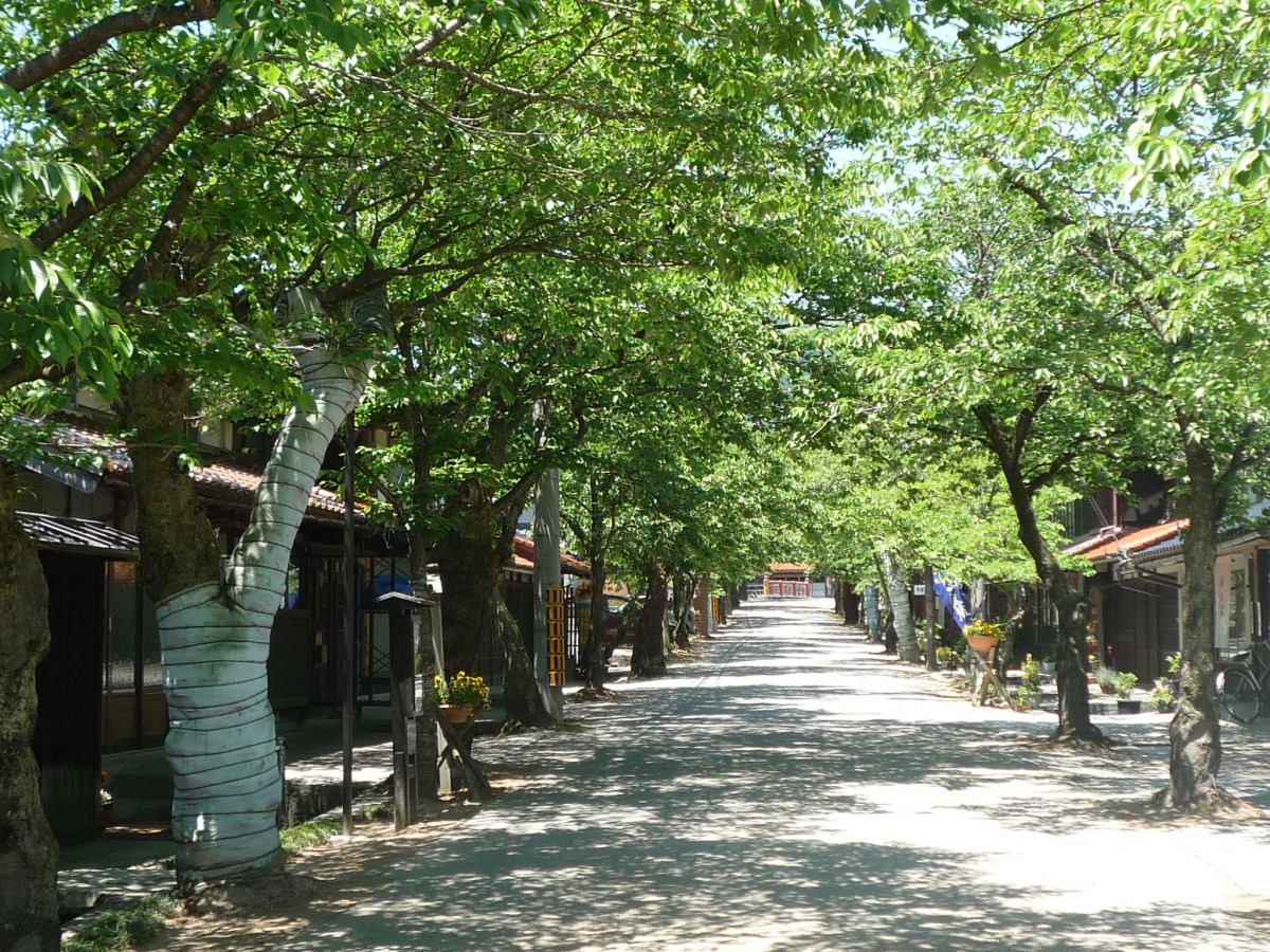 全国的にも珍しい宿場町の桜並木「がいせん桜」は、明治39年、日露戦争での戦勝を記念して137本の桜が植えられたものです。現在5.5mおきに133本のソメイヨシノがあり、桜並木のトンネルは新庄村の春を代表する景色です。通りの両側には、らさらと流れる水路があり、そのやさしい音色は「日本の音風景百選」、「日本のかおり風景百選」にも選ばれています。