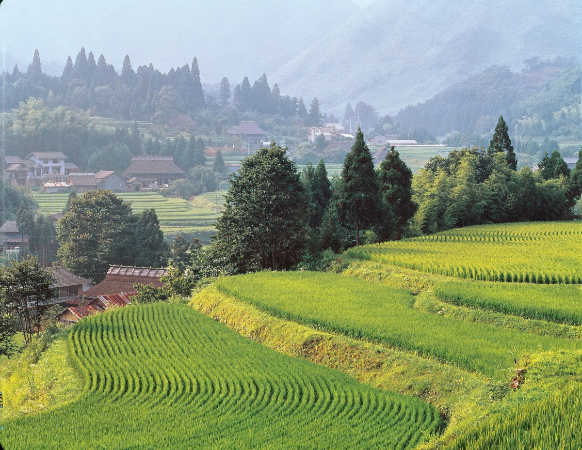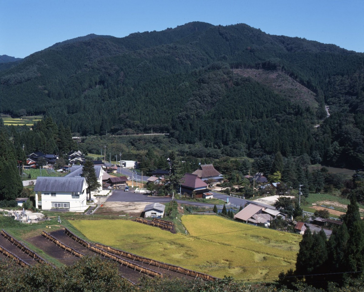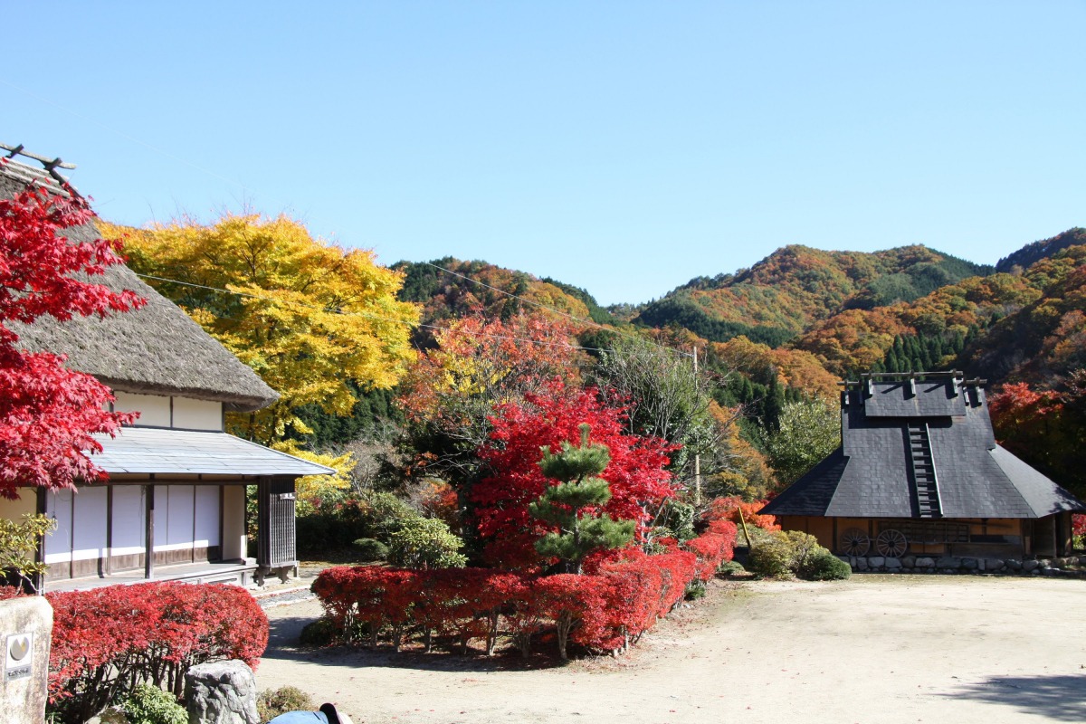 鏡野町の北部にある、標高1200mの山々に囲まれた山里です。かやぶき屋根と石畳、水車が特徴的な集落で、古くからたたら製鉄が行われてきた場所です。周囲には棚田もあり、刈り入れ時期には黄金色に染まった棚田と、それを見下ろす山々のコントラストが風情あふれる光景を生み出します。秋は周囲の紅葉も鮮やかで、「秋の紅葉まつり」も開催されています。