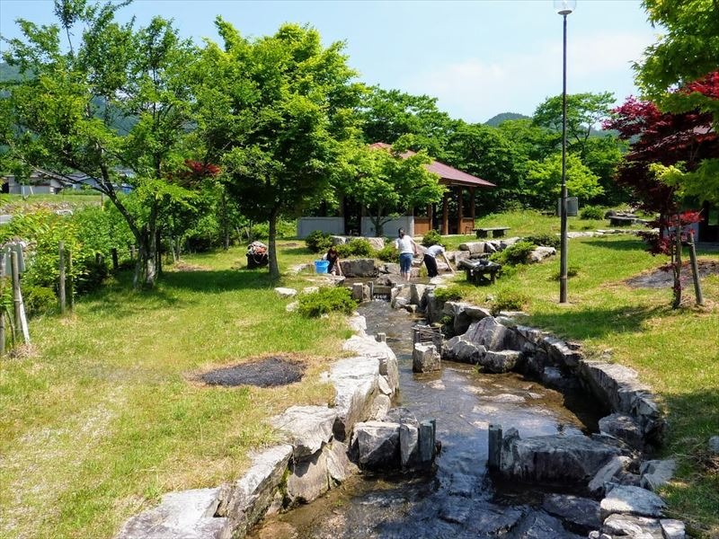 鏡野町羽出地区の泉源渓谷を抜けた先にある泉源園地は、大自然の中でヒラメのつかみ捕りが楽しめるスポットです。「ヒラメ」はこの地方で呼ばれている言葉で、海の魚の「ひらめ」ではなく、「あまご」のこと。調理棟とバーベキュー棟が完備されており、捕ったヒラメはその場で焼いて食べられます。