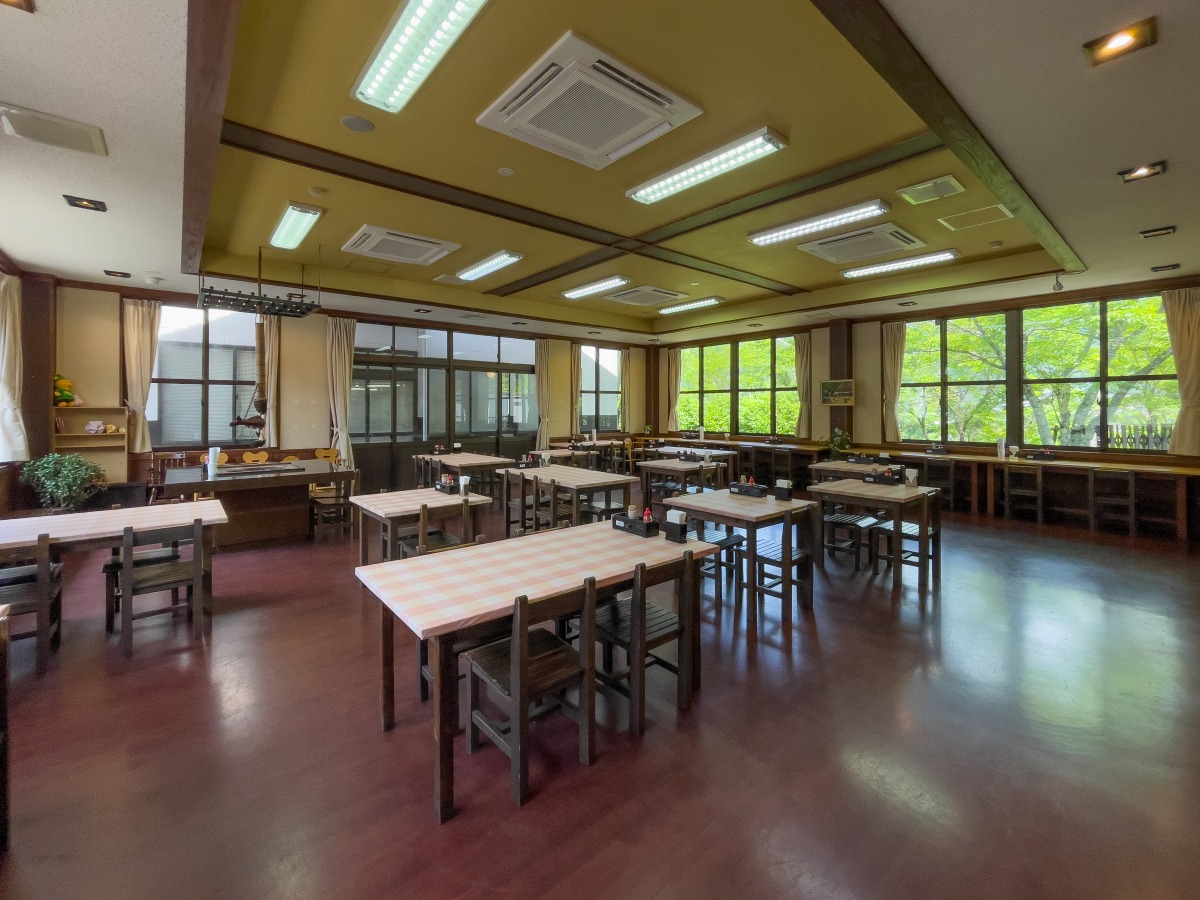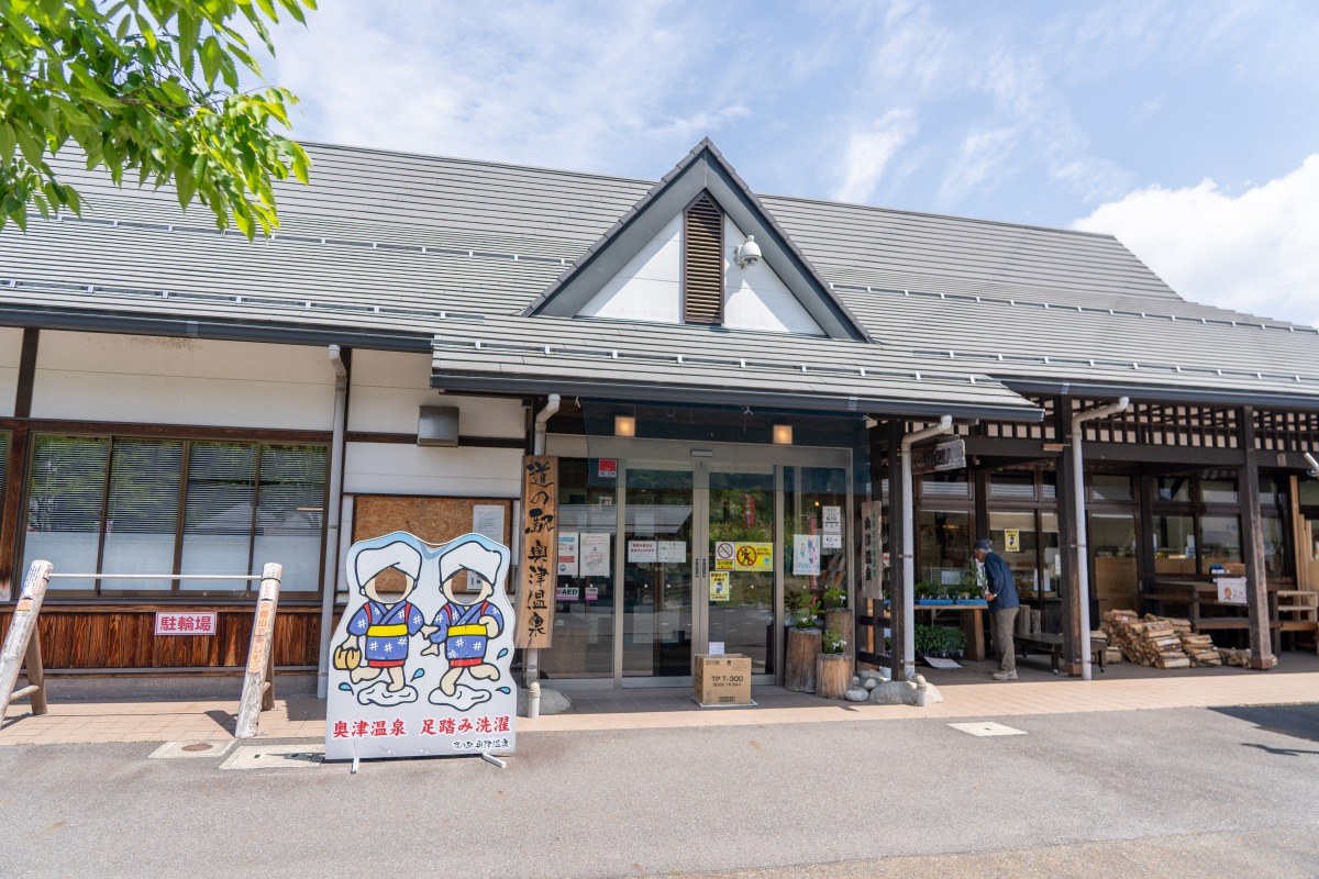 見晴らしがよい高台にあり、奥津温泉街が一望できます。物販ゾーンでは季節の野菜、花、加工品や木工品、お土産などを販売。物産館の中にある「お食事処 てっちりこ」では、地域でとれた山菜、特産品などを使った豊富なメニューが味わえます。また、裏入口には電気自動車用の急速充電器も設置されています。