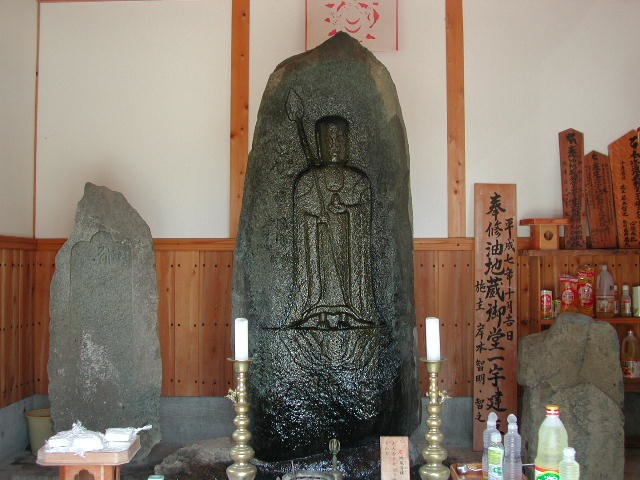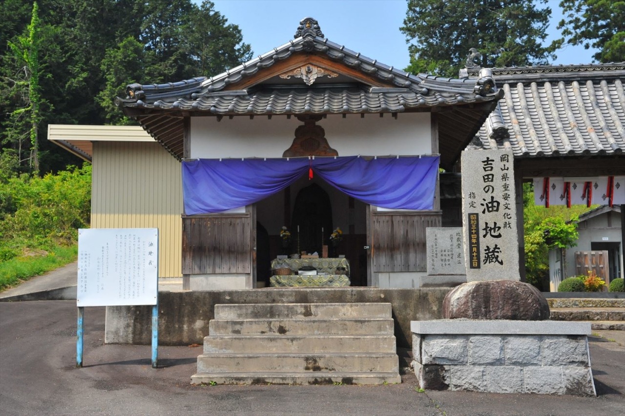 真言宗東光寺の山門外の地蔵堂に祀られ、縁日に油供養を行っていたことから「吉田の油地蔵」として親しまれています。像の左右に残る刻銘から、南北朝時代の1380(康暦2)年に、円仏の発願で造立されたことが分かります。花崗岩製で像高98cm。