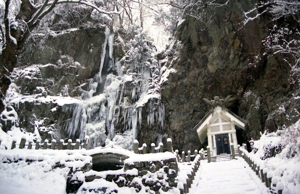 滝山の中腹、うっそうと茂った森の中にある瀧神社はひっそりと鎮座しています。背後の雄大な奥の院滝が凍結してつららとなる冬の景観も見事。ただし、滝本地区から登る道は自衛隊演習場内を通過するため、普段は施錠されています。最短ルートを利用して参拝できる特別なトレッキングツアーが毎年開催されています。