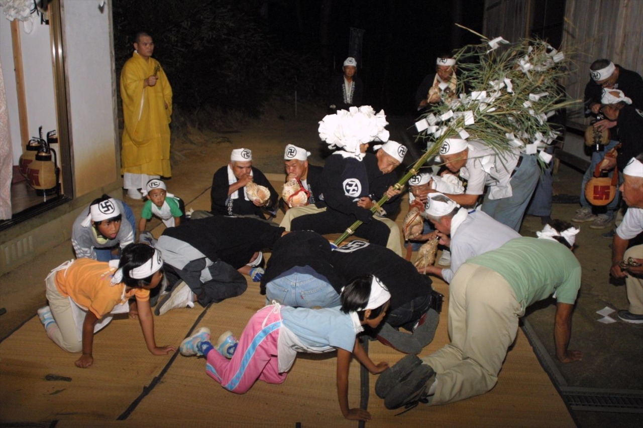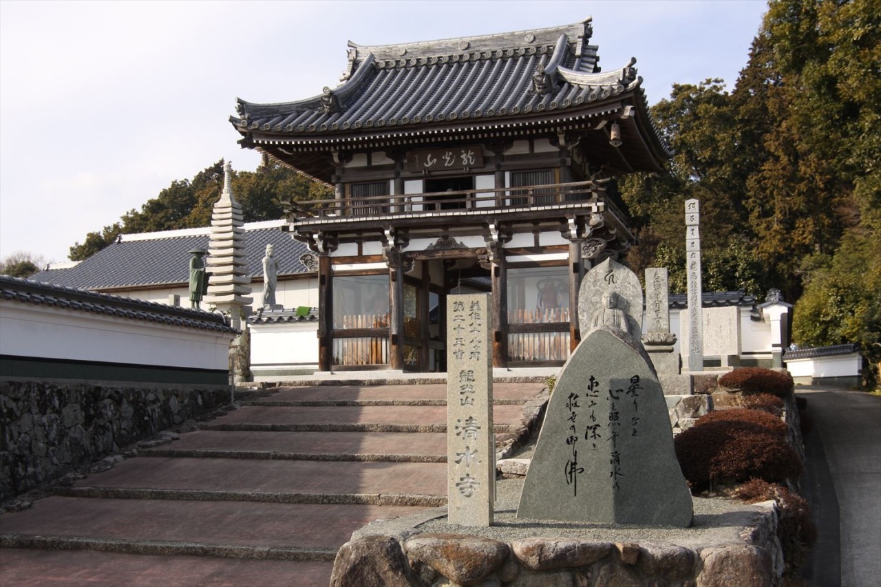 1577年(正徳5年)に建立された清水寺。県指定の無形文化財の奇祭、「護法祭」が伝承されています。五穀豊穣、天下泰平を祈願し、毎年5月15日深夜に行われます。護法善神が修験者らの祈りつけにより、行を終えて身を清めた「護法実」と呼ばれる人物の身に乗り移り、「御法楽」「お遊び」と称して、通称「ゴーサマ」が漆黒の闇に沈む境内を縦横無尽に駈け回る奇祭です。精進が足りない者は護法実に捕まり、災難にあったり命を落としたりすると伝えられることから、ゴーサマが近づくと参拝者は捕まるまいと悲鳴を上げて逃げまどいます。密教寺院で行われた山伏の行事がルーツだと言われています。全国でもこの久米郡にだけ残る奇祭で、現在、清水寺の他には3ヶ所しかありません。また、境内には樹齢数百年という榊の木があり、町の重要文化財に指定されています。