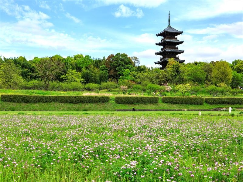 聖武天皇の発願によって諸国に建立された国分寺のひとつ。現在の建物は江戸時代中期以降に再建されたものです。境内にそびえる五重塔(国重文)は県内唯一のもので、吉備路の代表的な景観となっています。塔の内部には大日如来を意味する心柱を中心に阿閦、阿弥陀、宝生、不空成就の4体の如来像が安置されており、春のイベント「吉備路れんげまつり」などで一般公開されています。