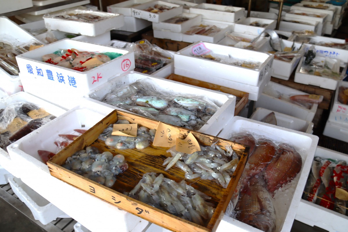 その日水揚げされた新鮮な魚介類が数多く並ぶ、笠岡市大島、正頭(しょうとう)漁港のそばにある「大島美の浜漁協本所」。朝9:00から一般客向けに販売が始まり、売り切れ次第閉店になります。