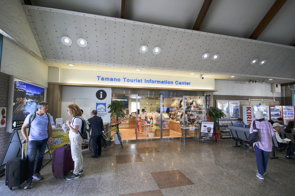 JR宇野みなと線・宇野駅構内にある観光案内所です。3年に一度開催される「瀬戸内国際芸術祭」の会場のひとつ「宇野港」へは徒歩でアクセス可能。直島、豊島といった瀬戸内の島々への本州側の玄関口にもなっています。玉野市内はもちろん、近隣の瀬戸内エリアの観光案内や、岡山県内・瀬戸内エリアの特産品・お土産品も販売。レンタサイクルもあります。