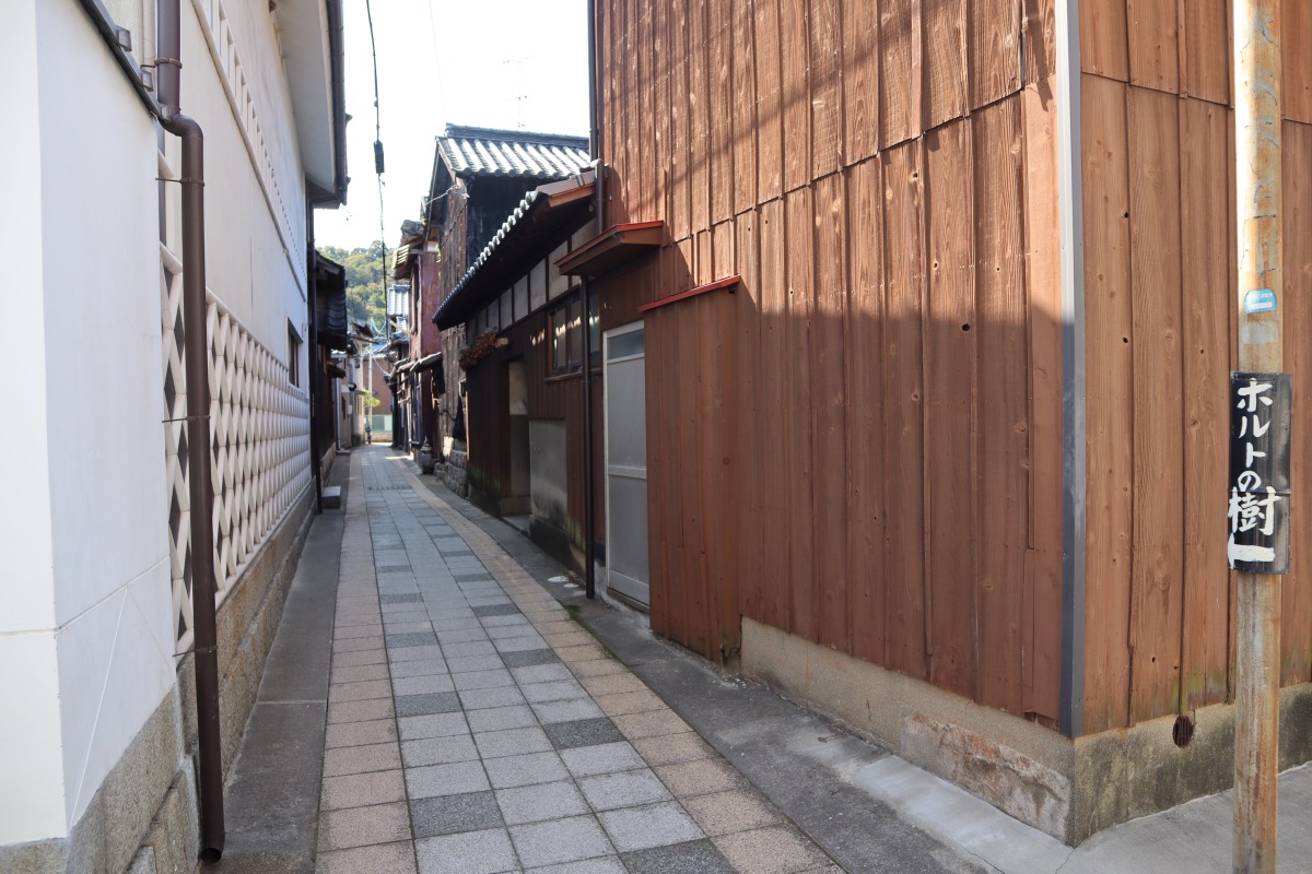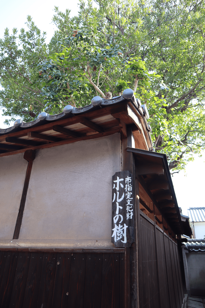 平安時代の末期から真鍋島の有力者として栄えてきた真鍋家の旧邸宅です。明治初期に建てられた木造家屋の主屋は国の登録文化財に指定されており、書院造りの座敷を有します。軒先には岡山県内では珍しい樹木「ホルトノキ」があり、樹齢約250年。ホルトノキは熱帯~亜熱帯性の常緑高木で、暖かい海岸沿いに自生するもので果実の形がオリーブに似ている植物です。一説には平賀源内が讃岐に苗木を持ち込んだものが、真鍋家に伝えられたといわれています。