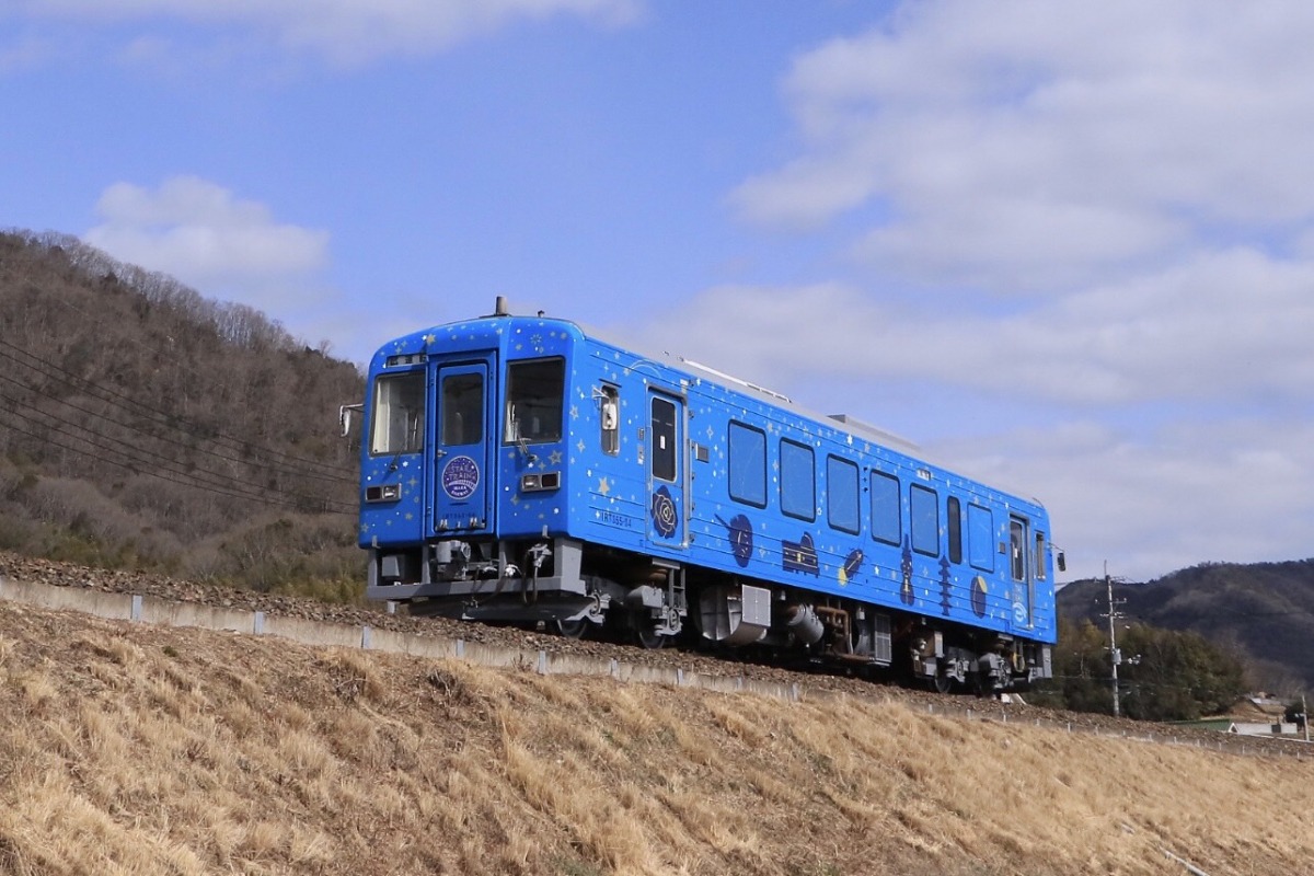 星空版の世界遺産といわれる国際ダークスカイ協会の「星空保護区(コミュニティ部門)」にアジアではじめて認定された井原市を中心に走る井原鉄道で、岡山県の美しい星空の魅力を発信するために造成された特別企画車両です。車両内外には「天文王国おかやま」を象徴する美しい夜空に12星座と地域の観光素材を溶け込ませたフルラッピングが施され、星空をテーマにした鉄道旅が楽しめます。