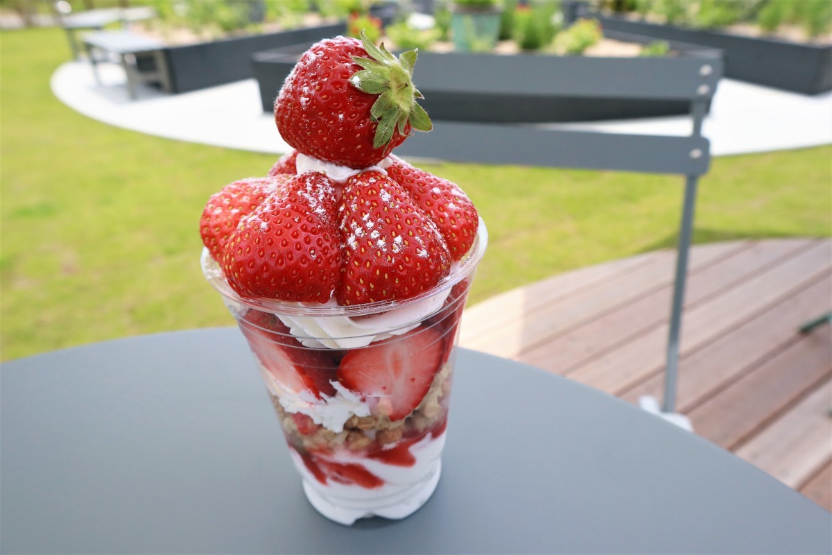 1,300平方メートルの開放感あるガーデンは、ローズガーデン、フラワーガーデン、ドライガーデン、グラスガーデン、カッティングガーデン、エディブルガーデン、キッズガーデンの7つのゾーンで構成。併設の「農園カフェ 湯郷」でオーダーできるクロワッサンサンドやピザ、自社農園のフルーツをたっぷり使ったスイーツ、オリジナルのクラフトビールなどを、季節を彩る花々を眺めながら味わえます。また園内には足湯コーナーもあり、湯郷温泉の名湯に花を浮かべて贅沢に堪能できます。