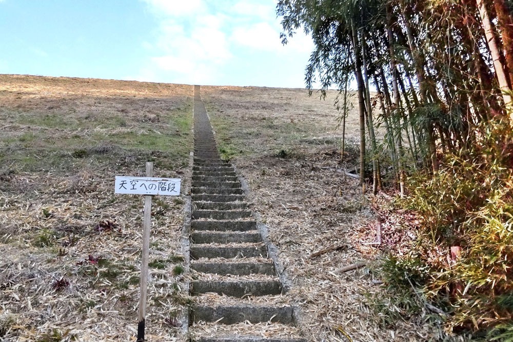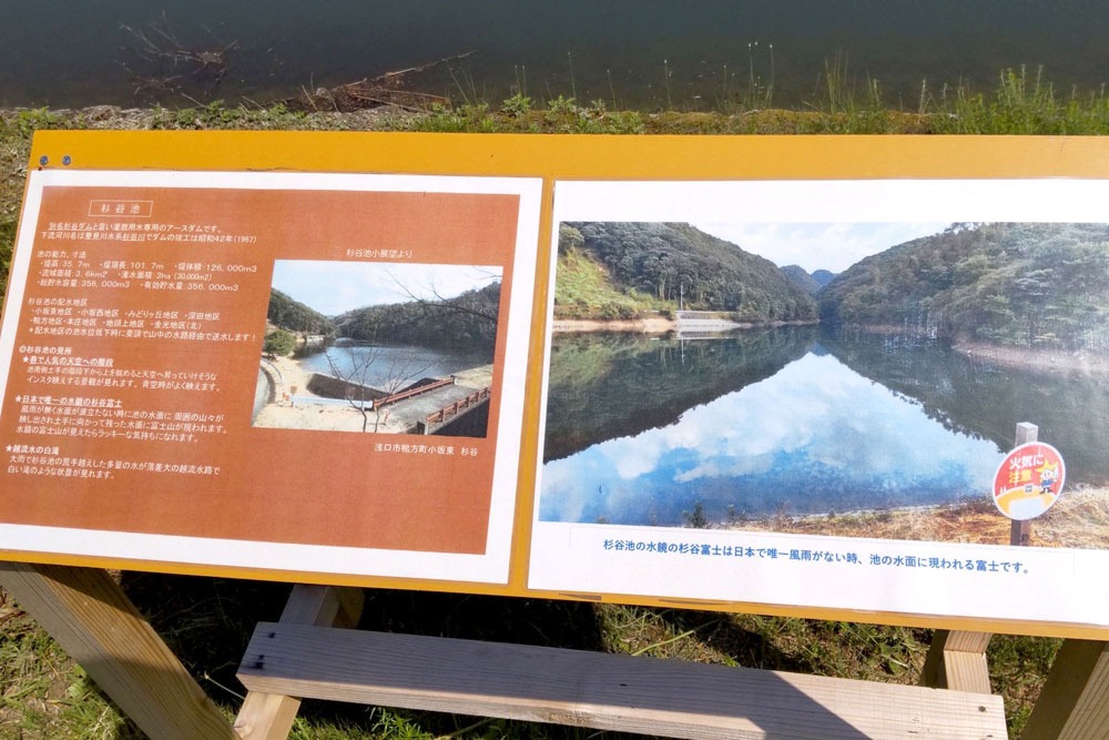 特に青空時にインスタ映えするスポットです。最初が「天空への階段」です!杉谷渓谷の杉谷池の南側土手中央に139段の点検用階段があります。この階段下からの景観が天空へ昇っていけそうに見えることで「天空への階段」と呼んでいます。天空への階段を登った先には「杉谷池の雄大な景観」が現われます。風、雨が無く水面が波立たない時に土手中央手前に向かって池の水面に富士山が見れます。この富士山を国内唯一の「水鏡の杉谷富士」と呼んでいます。水鏡の杉谷富士の奥には遠景スポットとしてハート形山が見えます。しあわせ気分になれそうなハート形山名を「杉谷ハート山」と命名しました。杉谷池のしあわせ4スポットは天空から招福(ハート)まで南北に一直線に並んでいる縁起がよいスポットです。