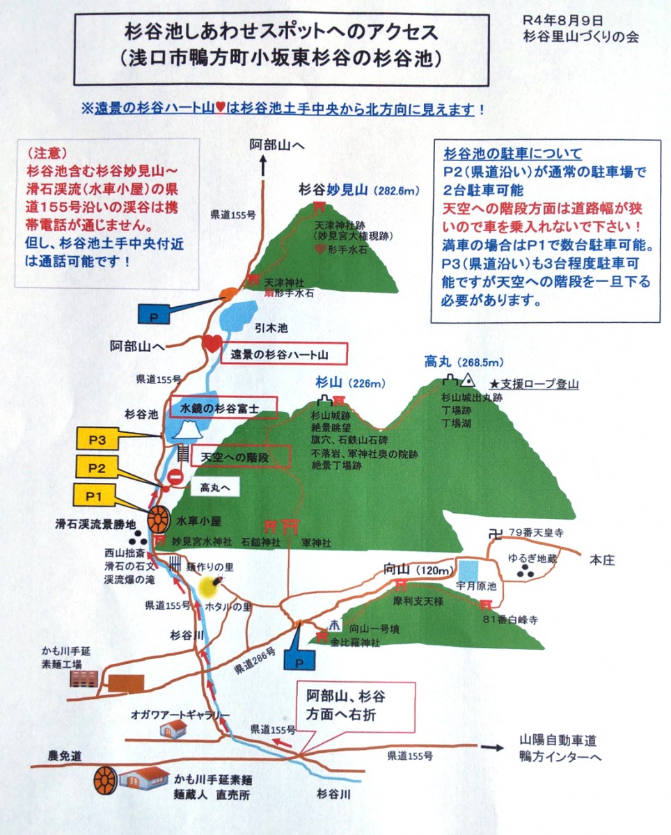 ぐるっと’杉谷の里山’めぐりコースの中の杉谷池にはしあわせ気分になれそうなしあわせスポットが4箇所あります。