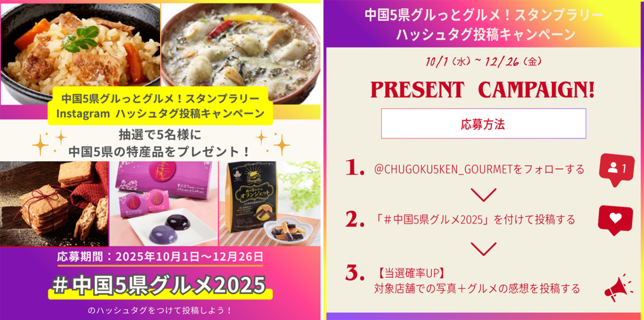 指定ハッシュタグ #中国5県グルメ2025 を付けて投稿すると、抽選で5名様に豪華特産品をプレゼント。